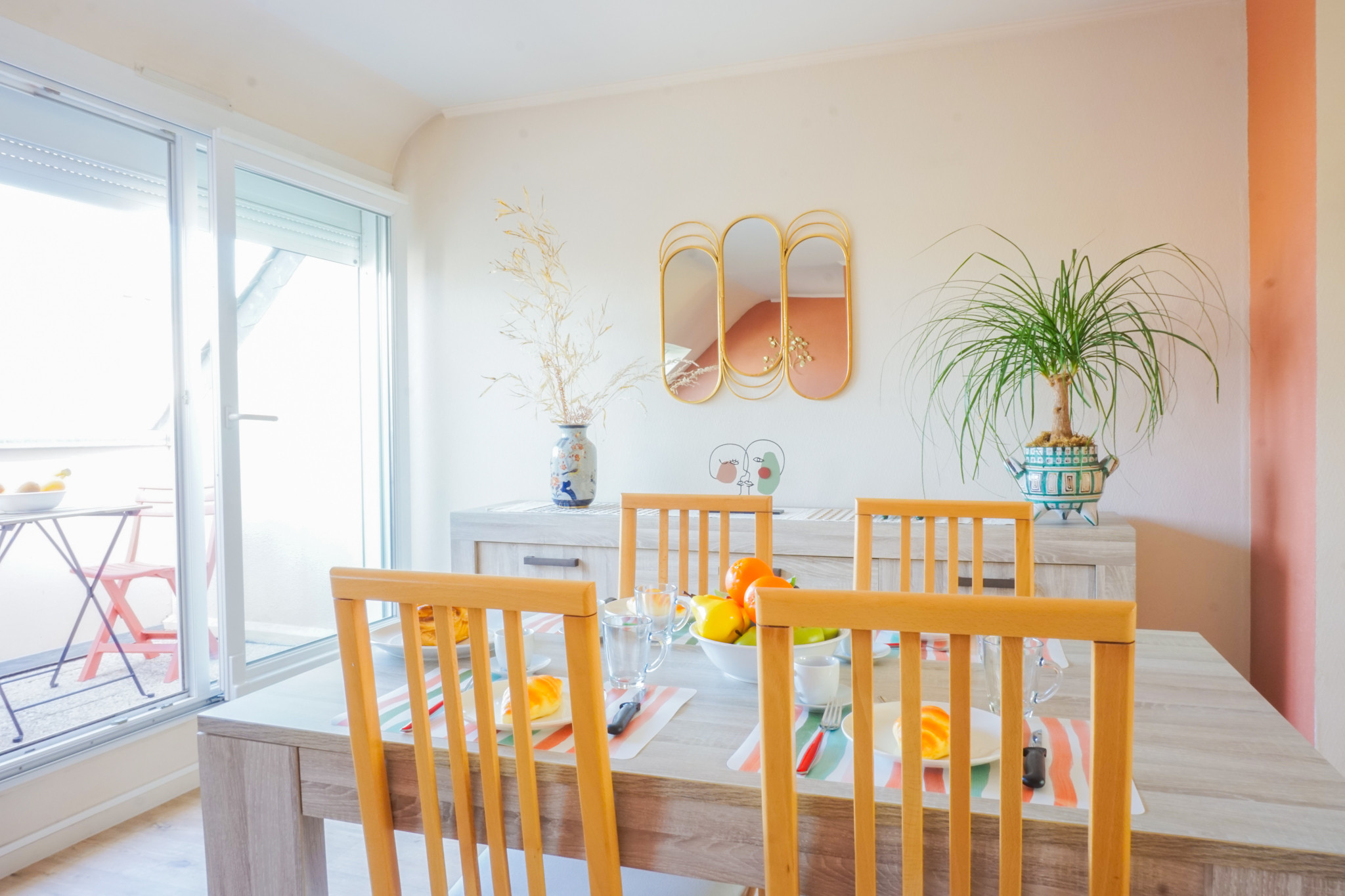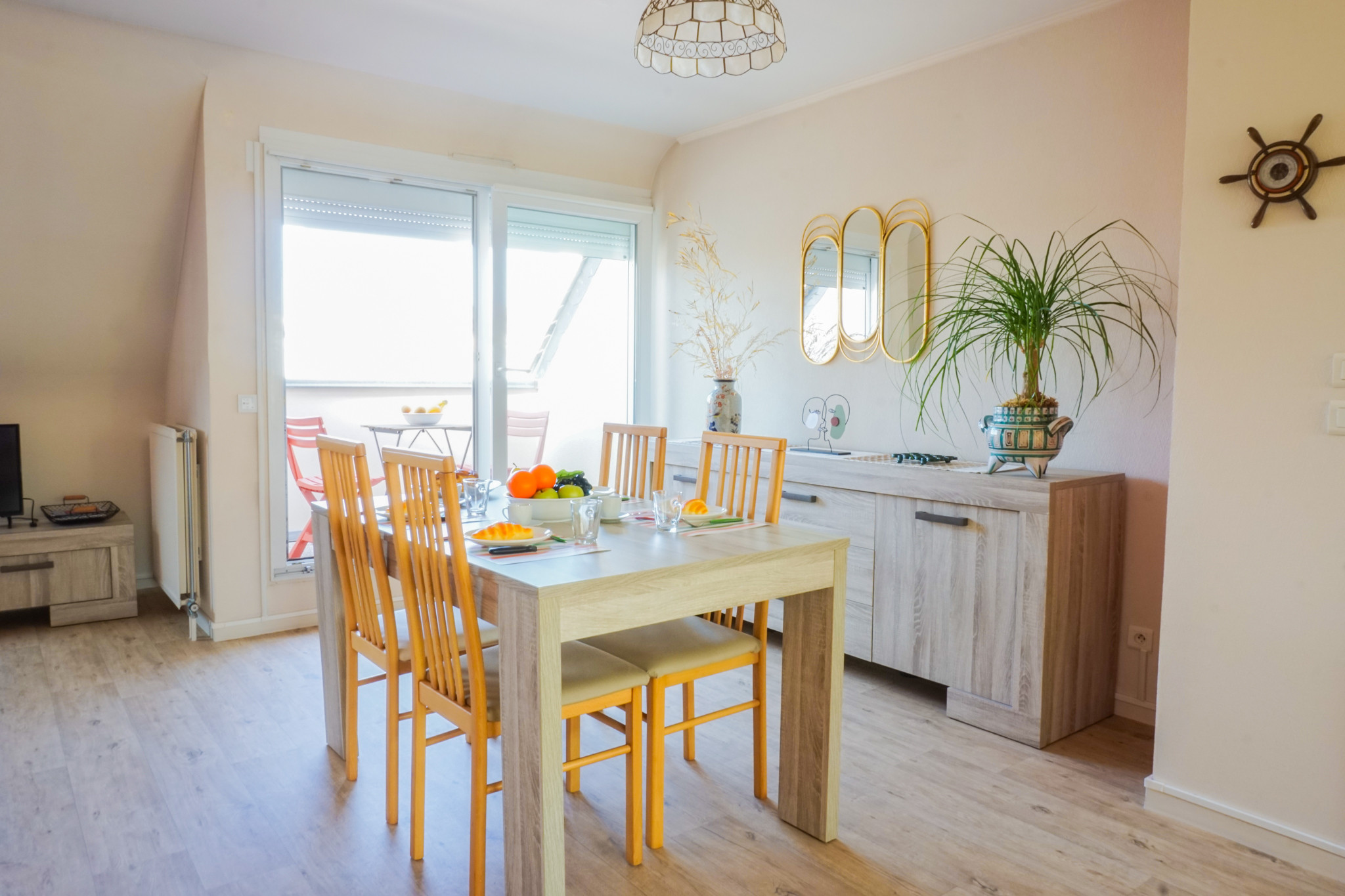 Le salon s’ouvre également sur un balcon, vous invitant à profiter de moment agréables en extérieur, que ce soit pour savourer un café le matin ou pour déguster un apéritif en fin de journée.