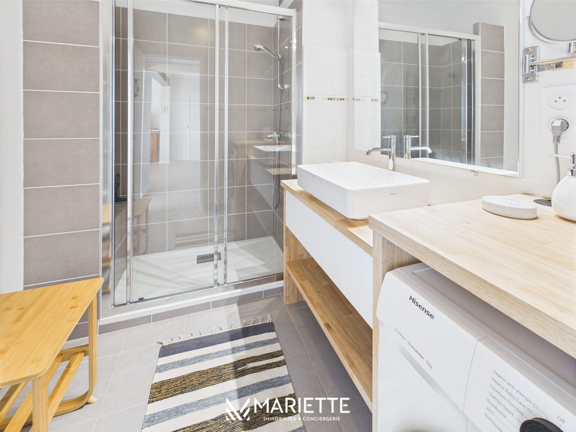 Un espace de vie lumineux, des matériaux de qualité, une cuisine entièrement équipée (avec une cafetière à filtres et une Nespresso), tout y est pensé pour rendre votre séjour exceptionnel. D'une surface de 60 m² il offre une entrée, un grand salon-séjour-cuisine, une belle chambre avec son lit king-size, une salle d’eau avec douche à l’italienne, une buanderie et un WC séparé.
