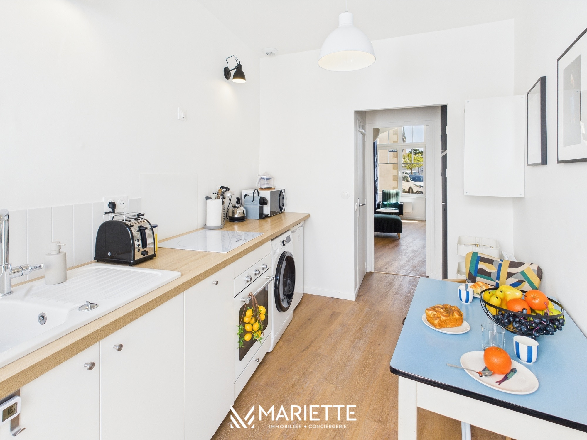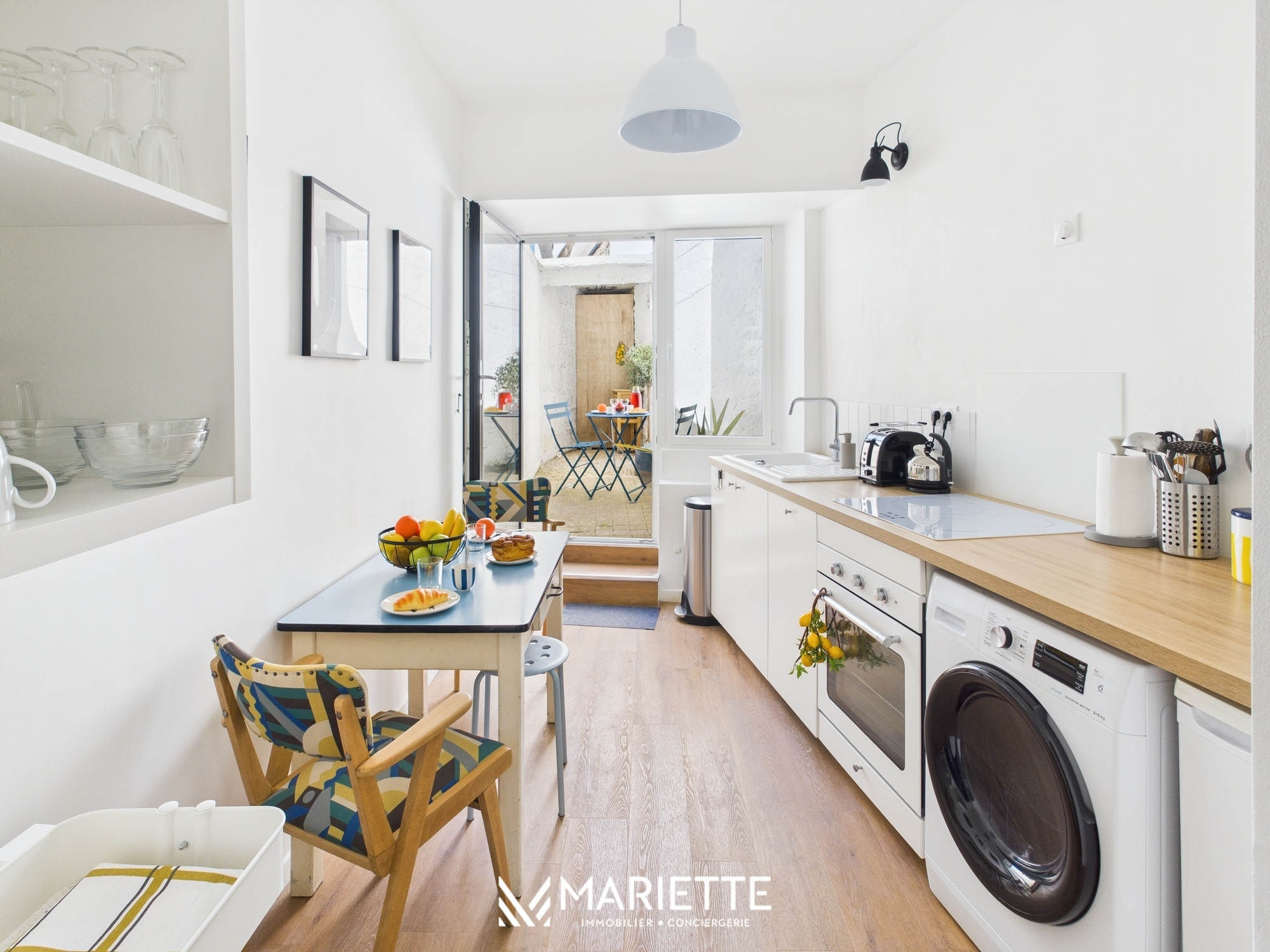 Vous trouverez ensuite la cuisine conviviale, entièrement équipée, parfaite pour préparer vos repas après une journée de découvertes. Elle s’ouvre également sur une petite cour privée, pour profiter d’un petit déjeuner en plein air.