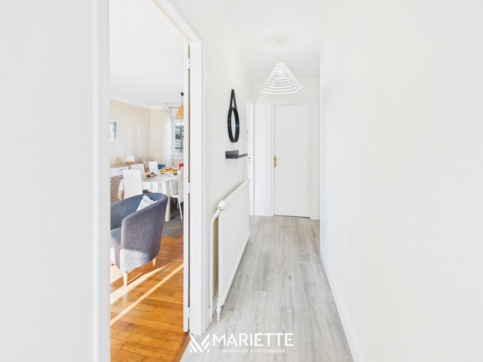 Un long couloir au rez de chaussé dessert une salle de bain, un WC séparé, une buanderie, ainsi qu’une chambre équipée d’une TV ce qui permet de profiter d’une vie de plain-pied.