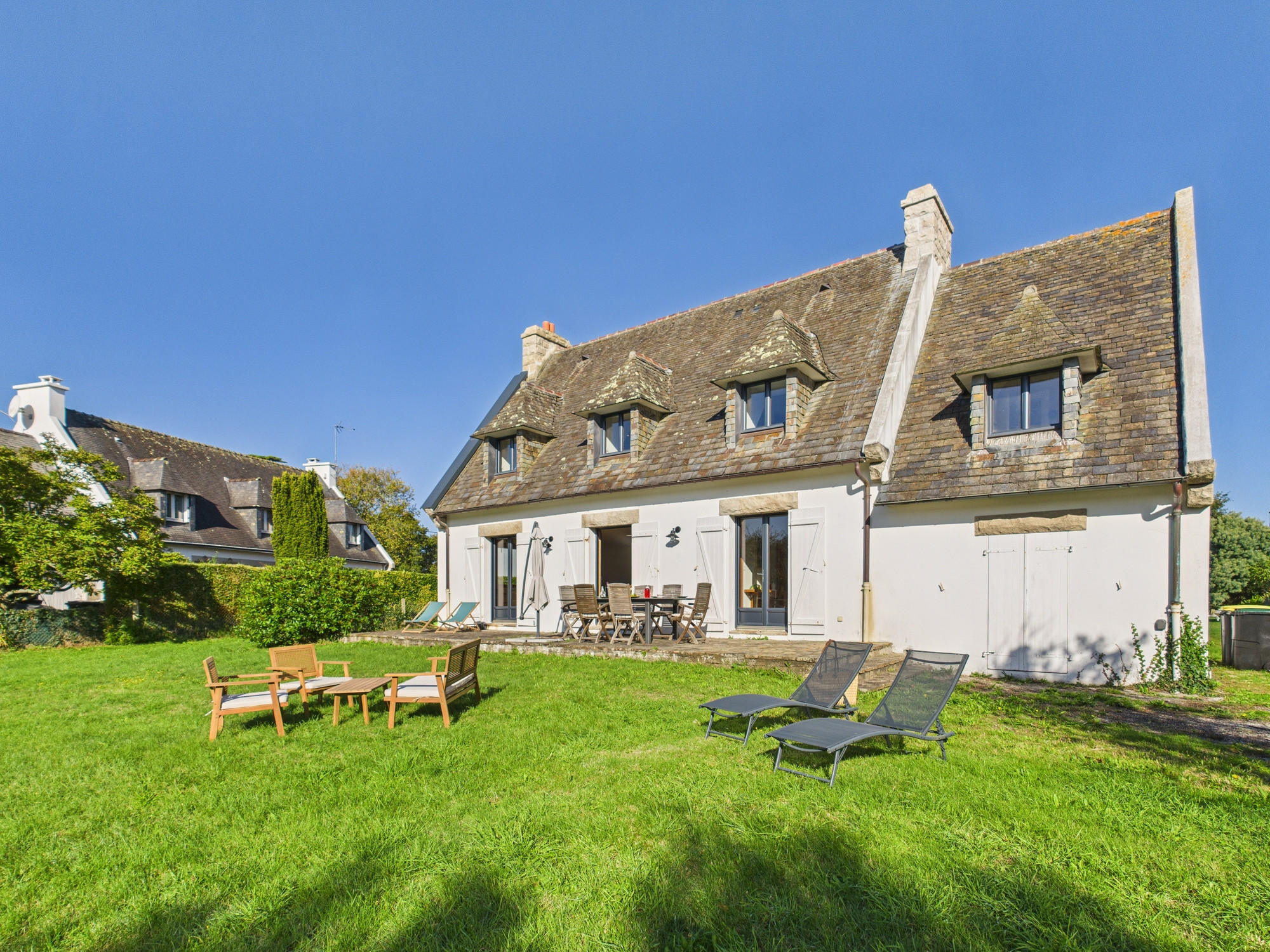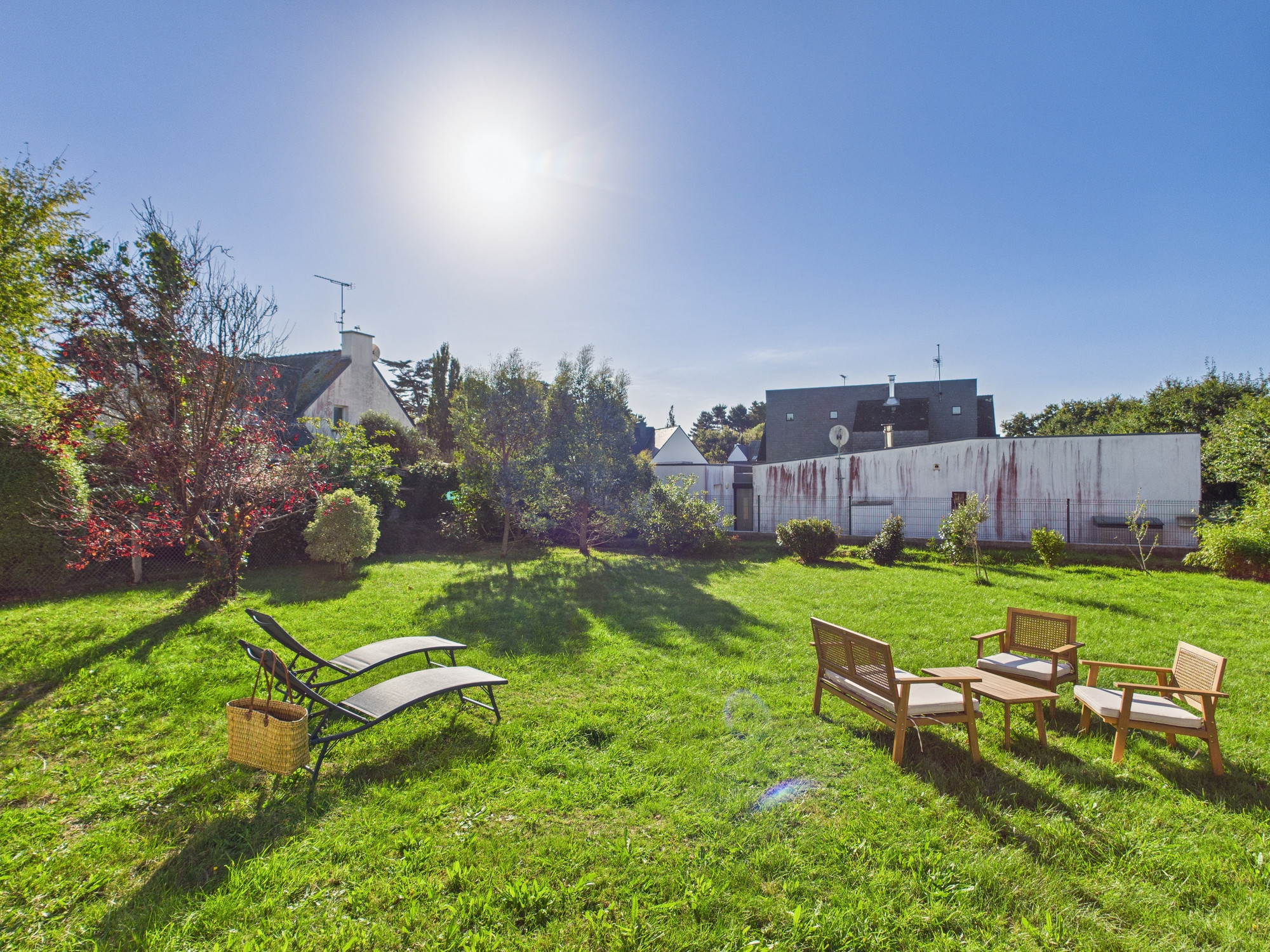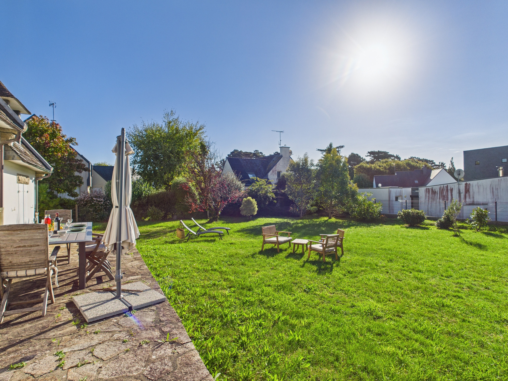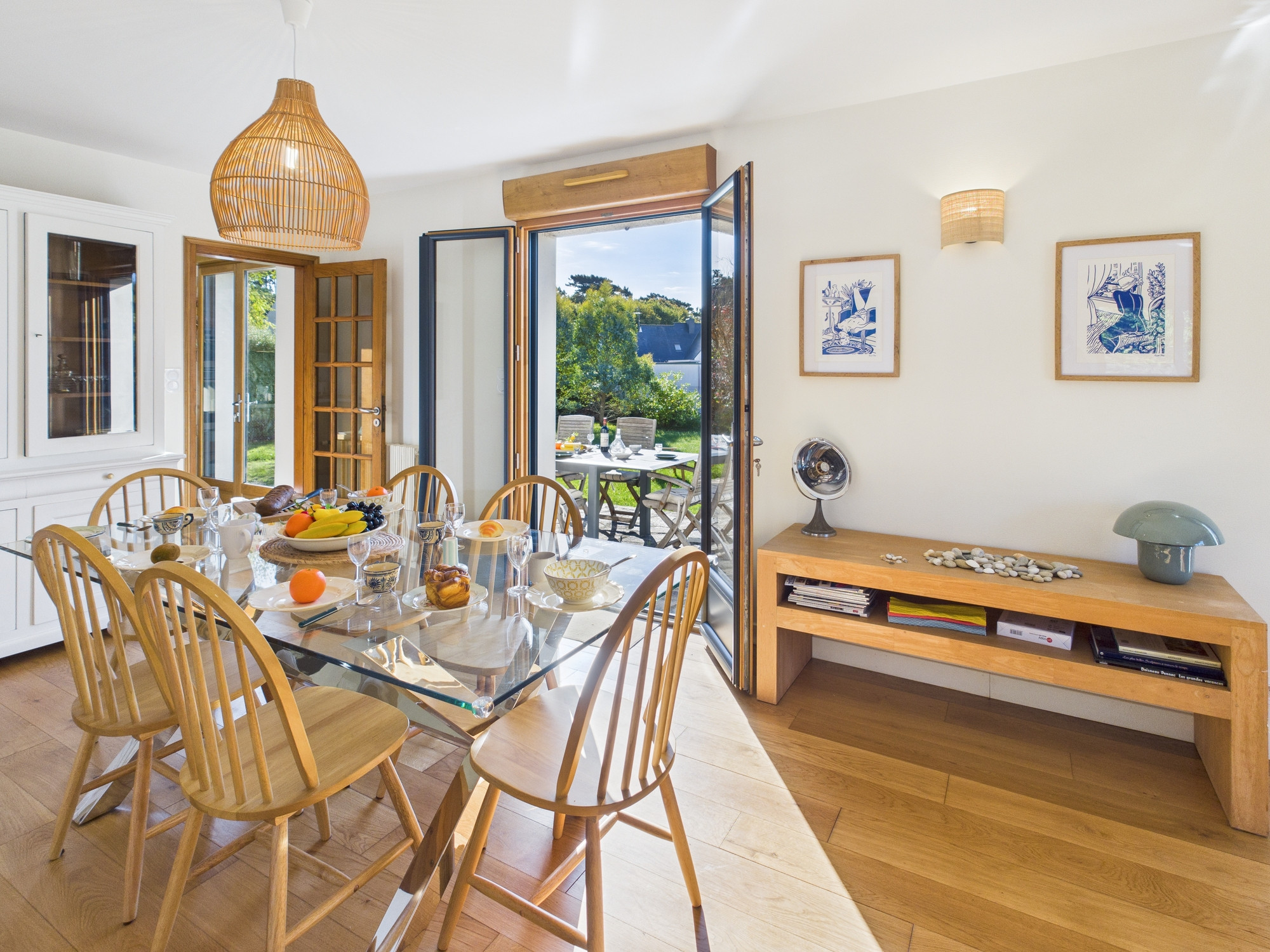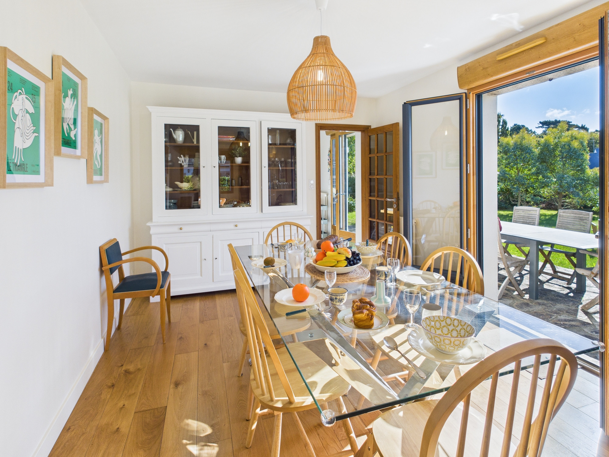 Vous serez accueilli par une grande entrée avec un bel escalier et plusieurs espaces de rangement pratiques pour vos affaires de plage et vos valises. Le vaste séjour, baigné de lumière et décoré avec modernité, se compose d’une salle à manger conviviale avec une grande table idéale pour les repas en famille ou entre amis, donnant directement sur la terrasse et le jardin. Le coin salon, spacieux et confortable, invite à la détente avec ses canapés douillets et son vidéoprojecteur pour vos soirées cinéma. La grande cuisine entièrement aménagée et équipée s’ouvre également sur la terrasse, parfaite pour profiter de l’extérieur tout en préparant les repas. Côté jardin, tout est pensé pour la détente : une grande table, des chaises, des transats, un petit banc, des fauteuils et un barbecue vous permettront de savourer le soleil breton et les apéros en plein air dans une ambiance paisible et verdoyante. À l’étage, vous trouverez une première chambre spacieuse avec une agréable vue sur le jardin, parfaite pour se réveiller au calme. Une seconde grande chambre équipée d’un lit double offre également un cadre confortable et lumineux. La salle de bain, élégante et fonctionnelle, dispose d’une baignoire pour se détendre après une journée de plage ou de balade sur la côte. Pour accueillir petits et grands, une chambre avec un lit simple (90 cm) et une autre avec deux lits superposés complètent l’étage. L’ensemble est décoré avec beaucoup de goût, mêlant douceur, couleurs naturelles et de jolies illustrations.