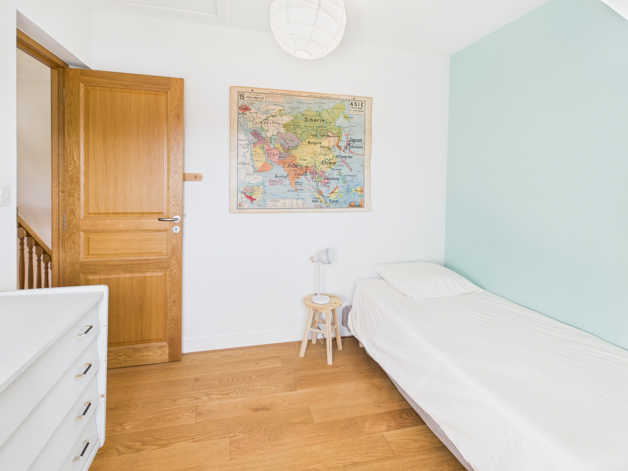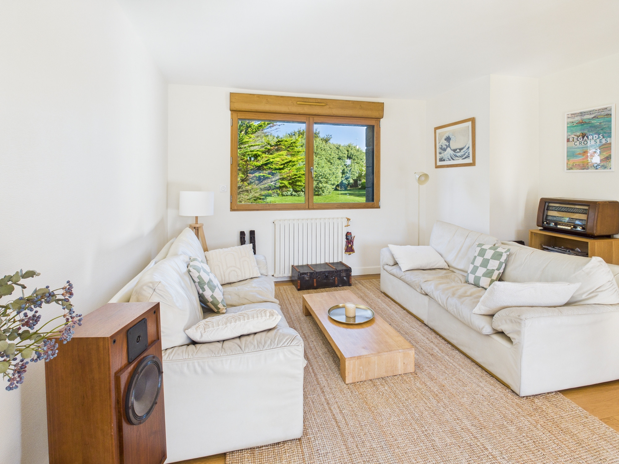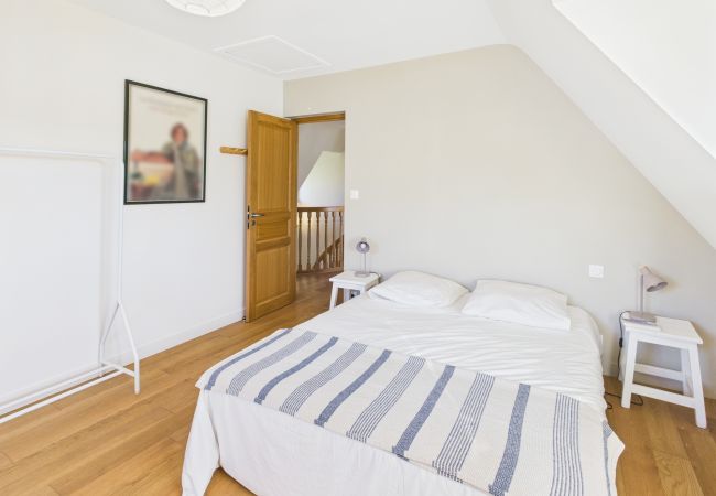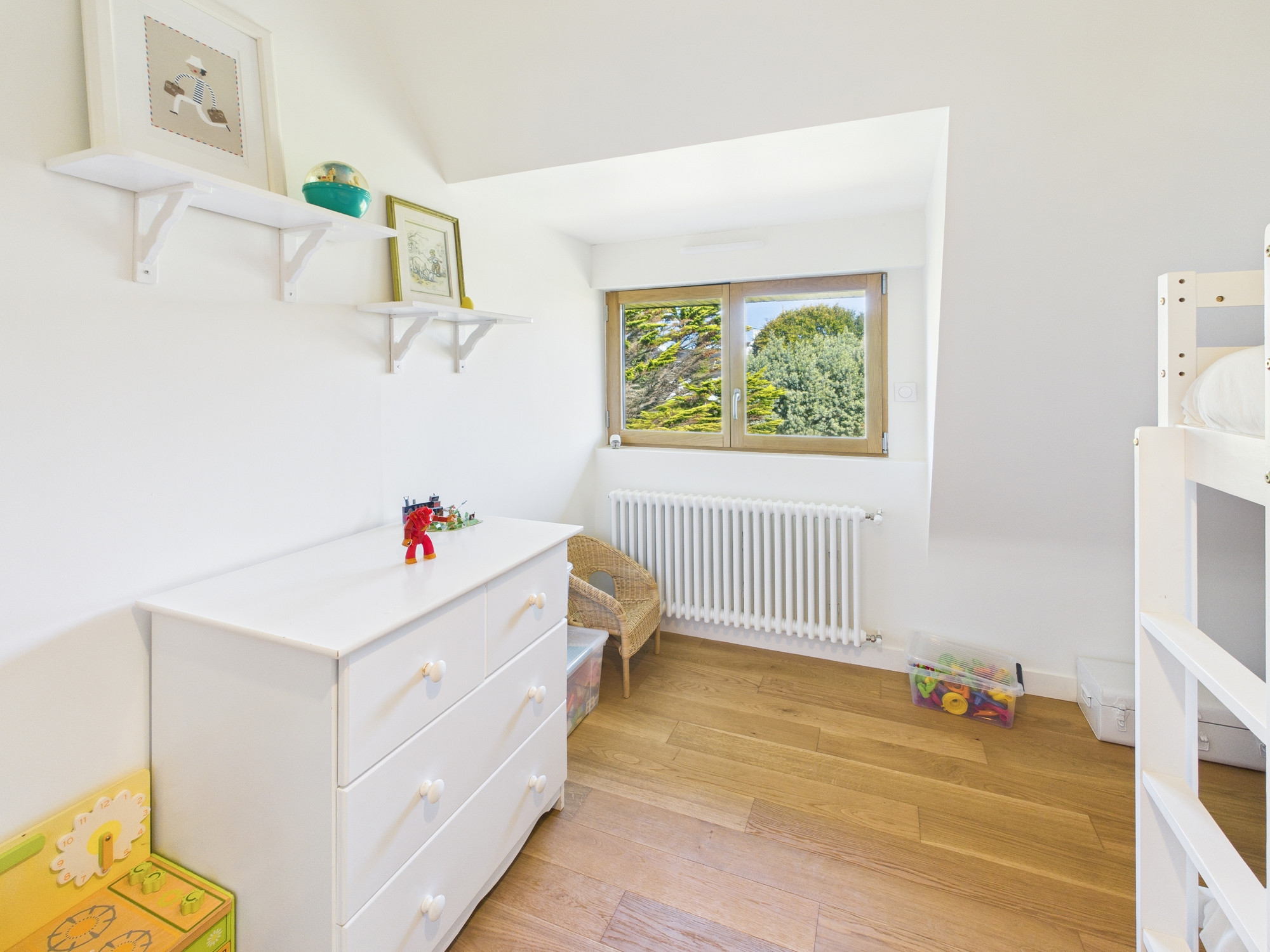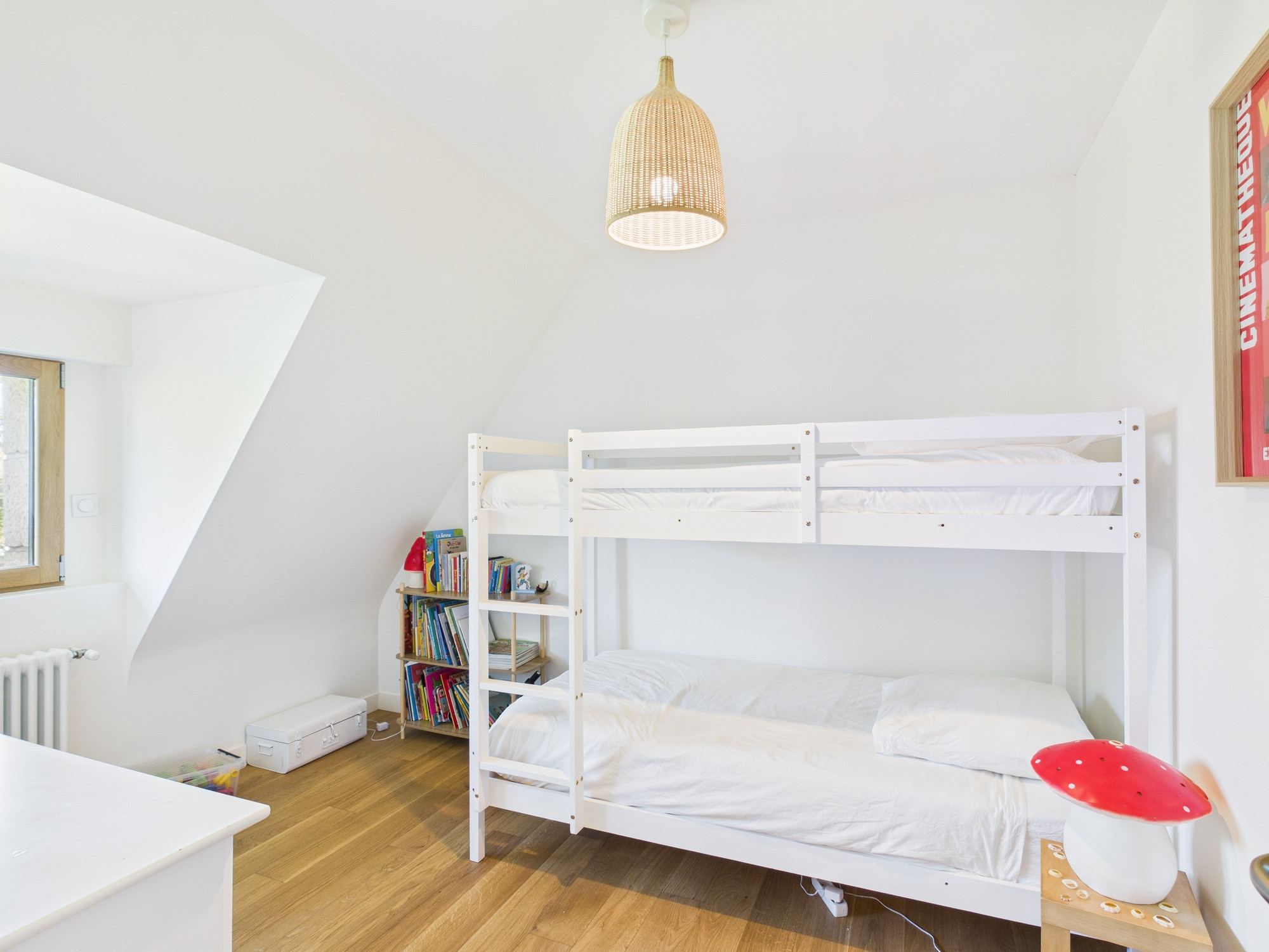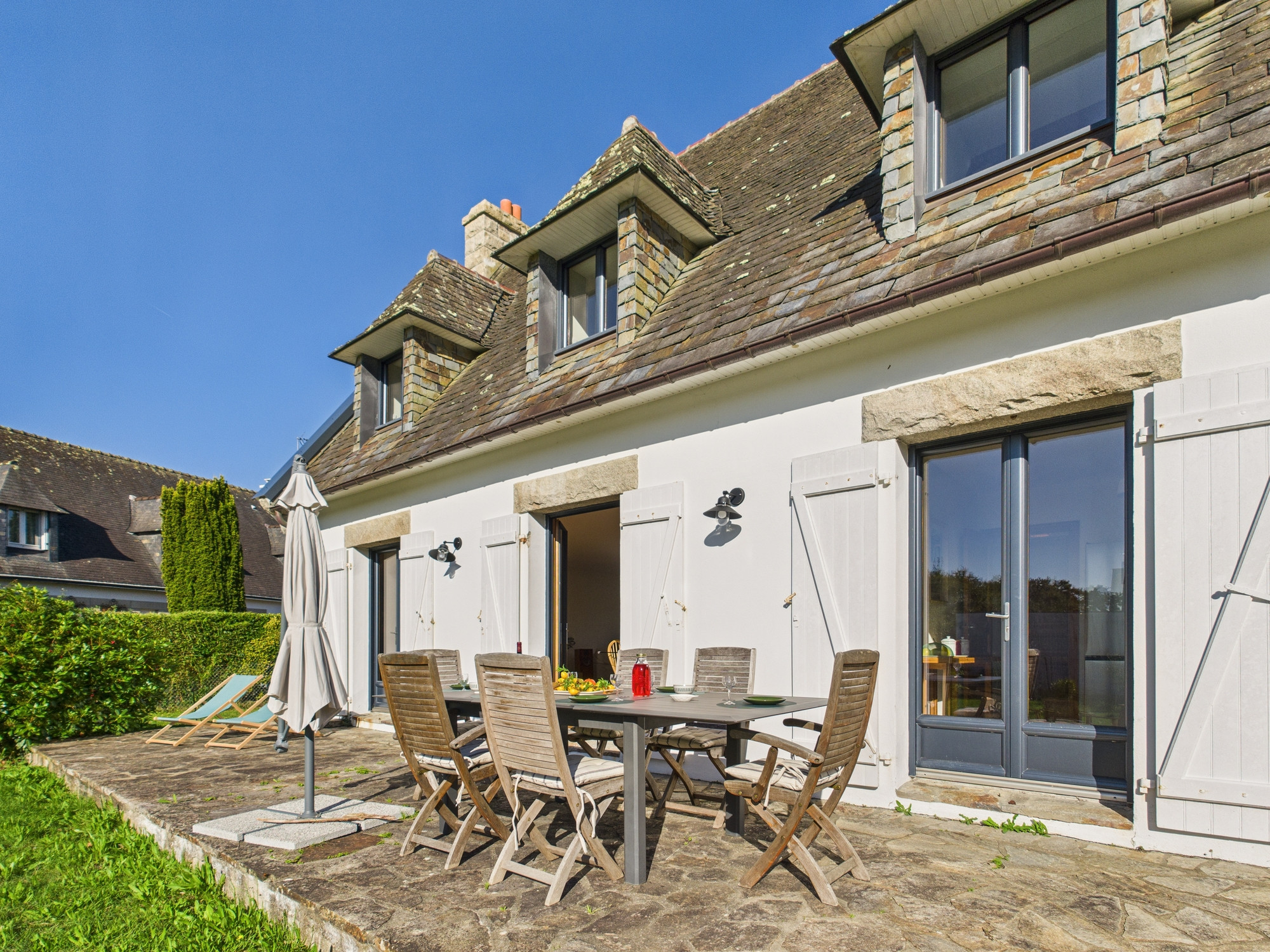 Vous serez accueilli par une grande entrée avec un bel escalier et plusieurs espaces de rangement pratiques pour vos affaires de plage et vos valises. Le vaste séjour, baigné de lumière et décoré avec modernité, se compose d’une salle à manger conviviale avec une grande table idéale pour les repas en famille ou entre amis, donnant directement sur la terrasse et le jardin. Le coin salon, spacieux et confortable, invite à la détente avec ses canapés douillets et son vidéoprojecteur pour vos soirées cinéma. La grande cuisine entièrement aménagée et équipée s’ouvre également sur la terrasse, parfaite pour profiter de l’extérieur tout en préparant les repas. Côté jardin, tout est pensé pour la détente : une grande table, des chaises, des transats, un petit banc, des fauteuils et un barbecue vous permettront de savourer le soleil breton et les apéros en plein air dans une ambiance paisible et verdoyante. À l’étage, vous trouverez une première chambre spacieuse avec une agréable vue sur le jardin, parfaite pour se réveiller au calme. Une seconde grande chambre équipée d’un lit double offre également un cadre confortable et lumineux. La salle de bain, élégante et fonctionnelle, dispose d’une baignoire pour se détendre après une journée de plage ou de balade sur la côte. Pour accueillir petits et grands, une chambre avec un lit simple (90 cm) et une autre avec deux lits superposés complètent l’étage. L’ensemble est décoré avec beaucoup de goût, mêlant douceur, couleurs naturelles et de jolies illustrations.