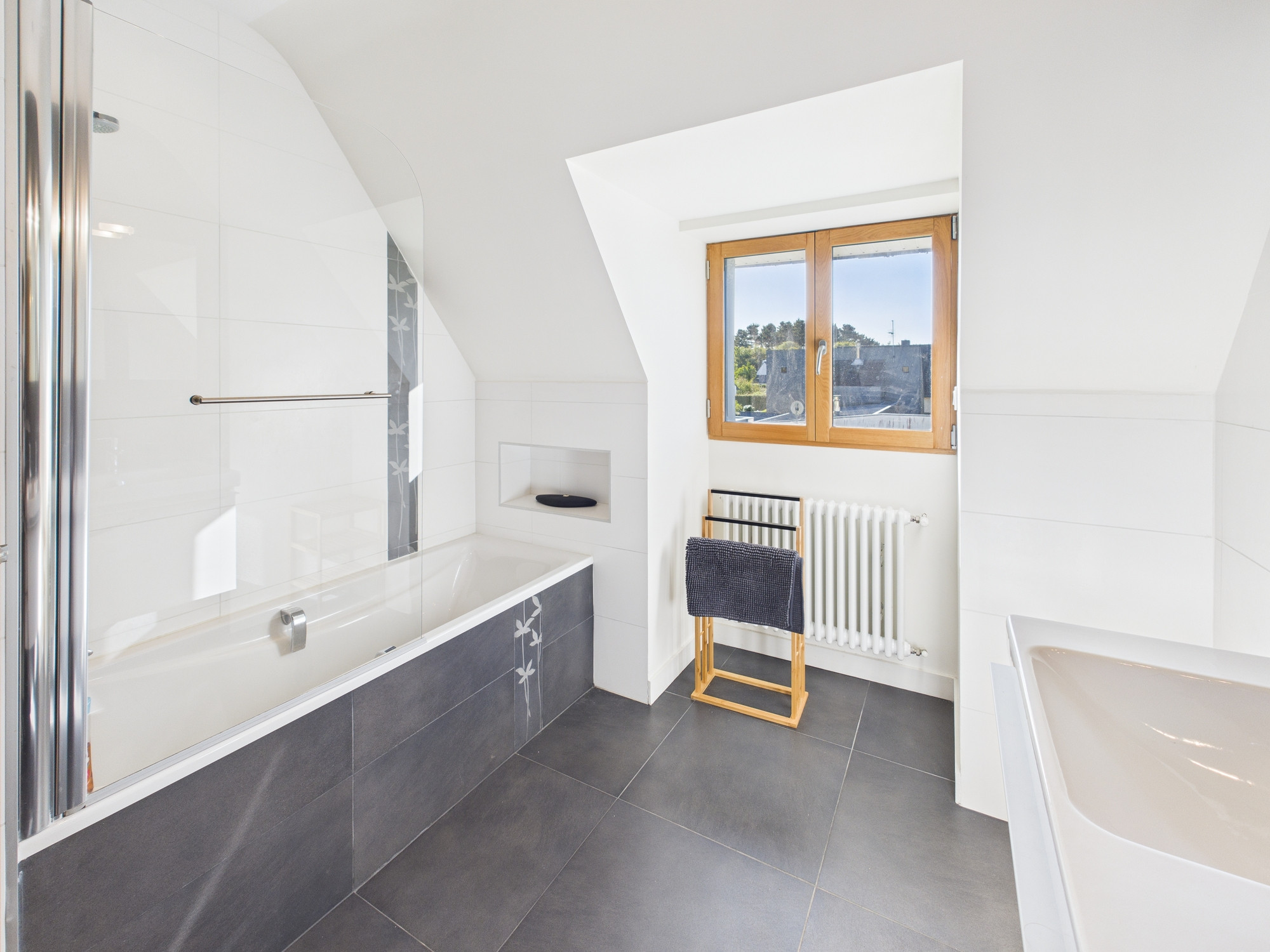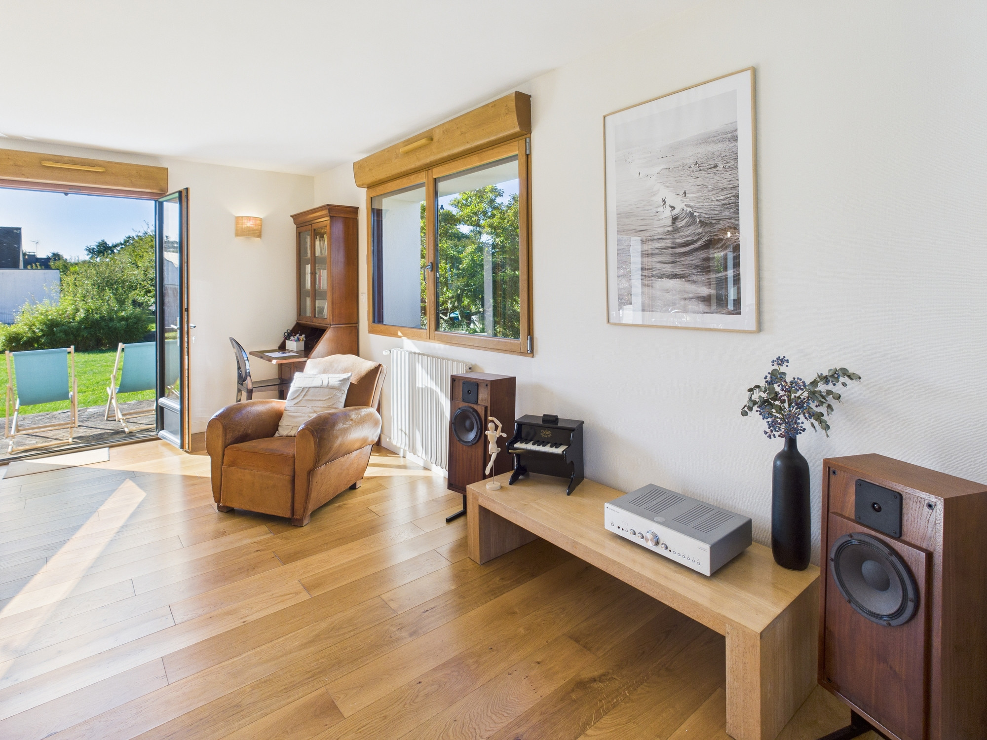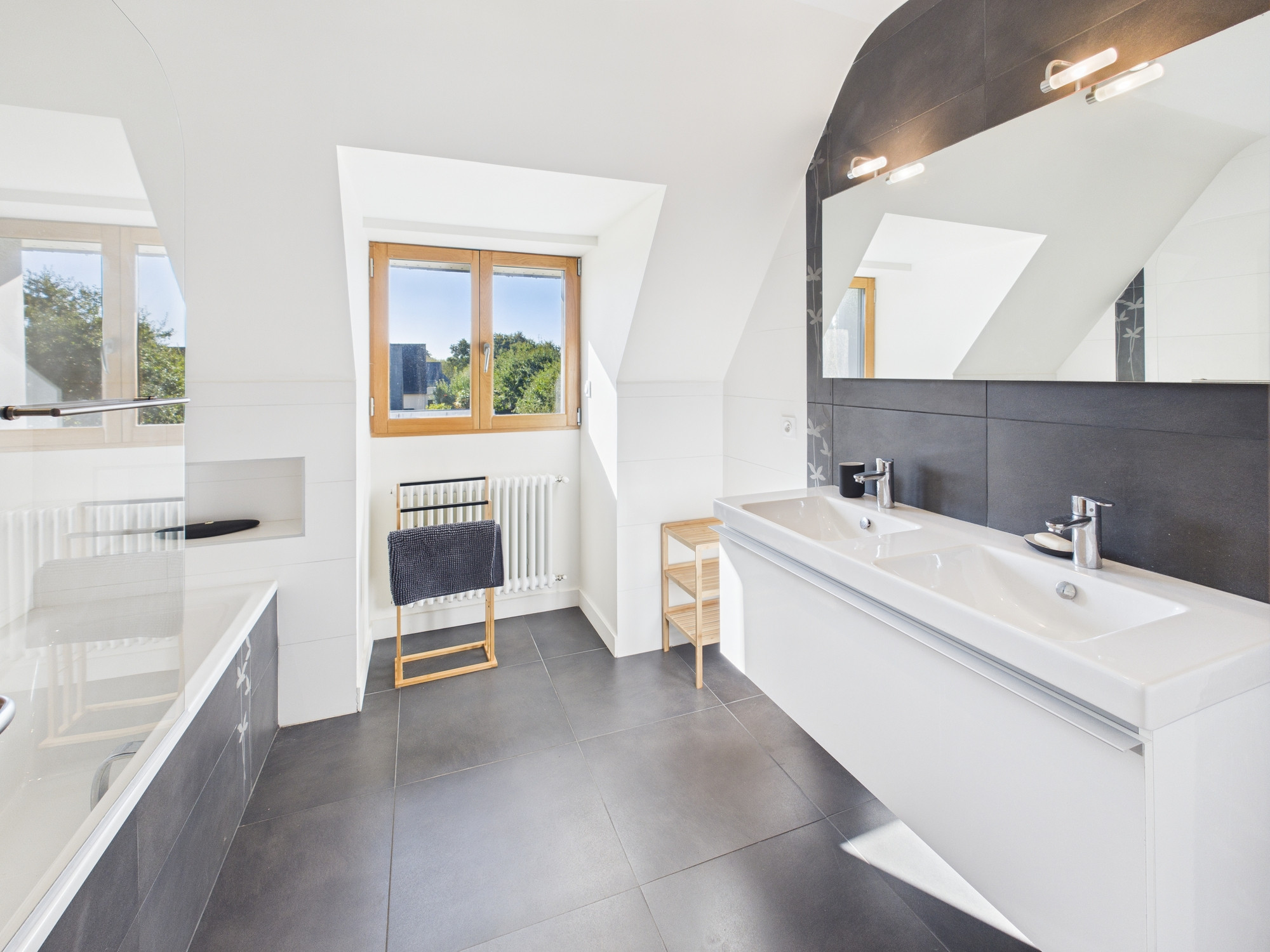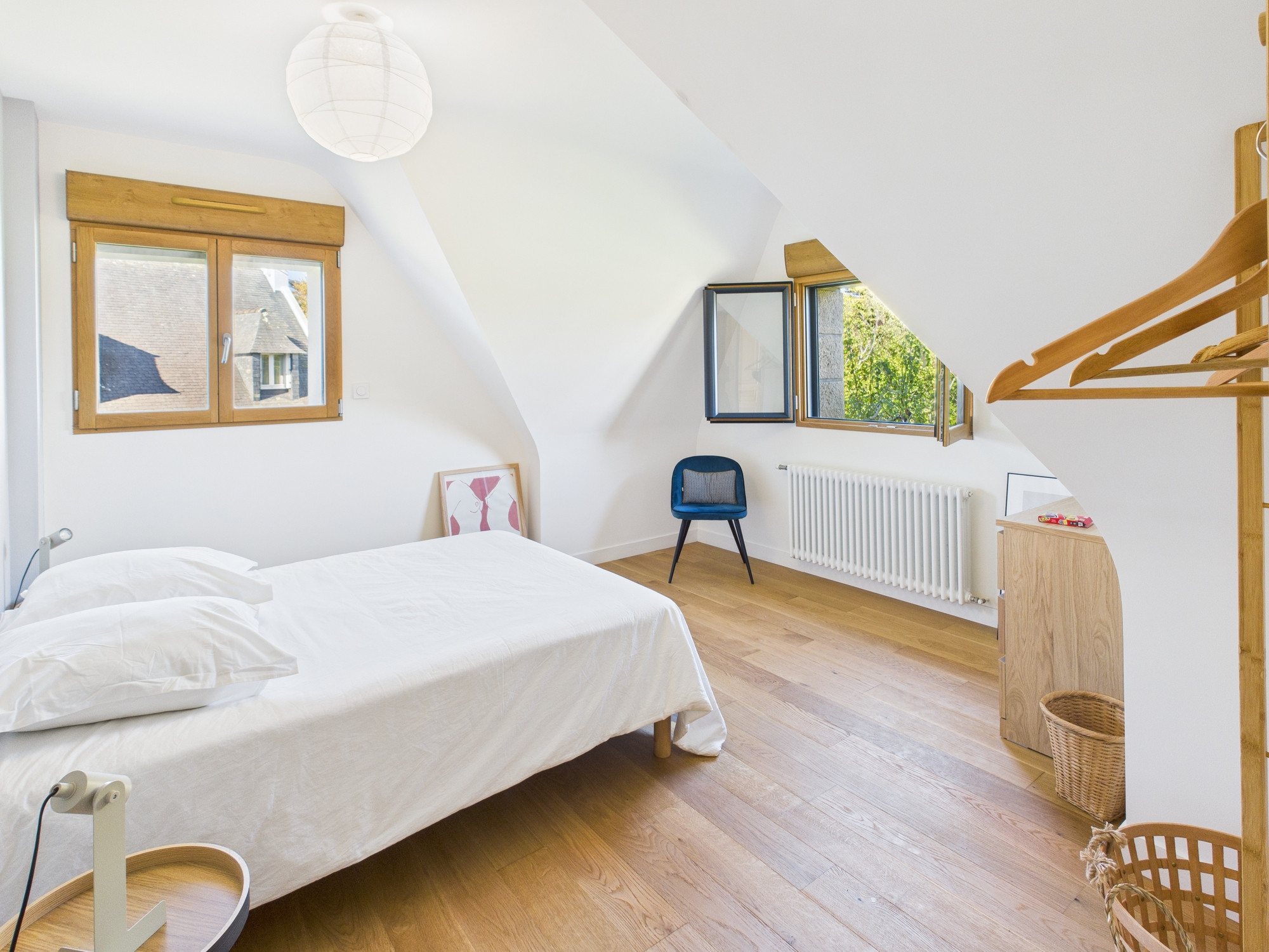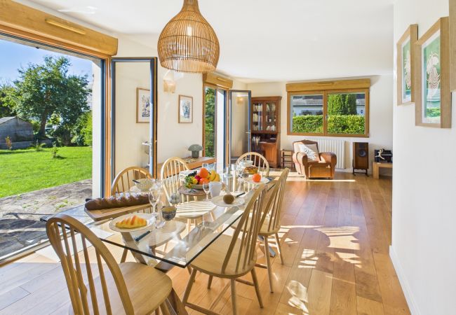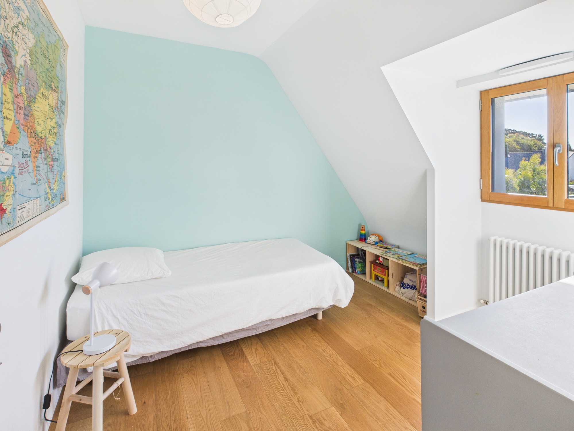 Vous serez accueilli par une grande entrée avec un bel escalier et plusieurs espaces de rangement pratiques pour vos affaires de plage et vos valises. Le vaste séjour, baigné de lumière et décoré avec modernité, se compose d’une salle à manger conviviale avec une grande table idéale pour les repas en famille ou entre amis, donnant directement sur la terrasse et le jardin. Le coin salon, spacieux et confortable, invite à la détente avec ses canapés douillets et son vidéoprojecteur pour vos soirées cinéma. La grande cuisine entièrement aménagée et équipée s’ouvre également sur la terrasse, parfaite pour profiter de l’extérieur tout en préparant les repas. Côté jardin, tout est pensé pour la détente : une grande table, des chaises, des transats, un petit banc, des fauteuils et un barbecue vous permettront de savourer le soleil breton et les apéros en plein air dans une ambiance paisible et verdoyante. À l’étage, vous trouverez une première chambre spacieuse avec une agréable vue sur le jardin, parfaite pour se réveiller au calme. Une seconde grande chambre équipée d’un lit double offre également un cadre confortable et lumineux. La salle de bain, élégante et fonctionnelle, dispose d’une baignoire pour se détendre après une journée de plage ou de balade sur la côte. Pour accueillir petits et grands, une chambre avec un lit simple (90 cm) et une autre avec deux lits superposés complètent l’étage. L’ensemble est décoré avec beaucoup de goût, mêlant douceur, couleurs naturelles et de jolies illustrations.