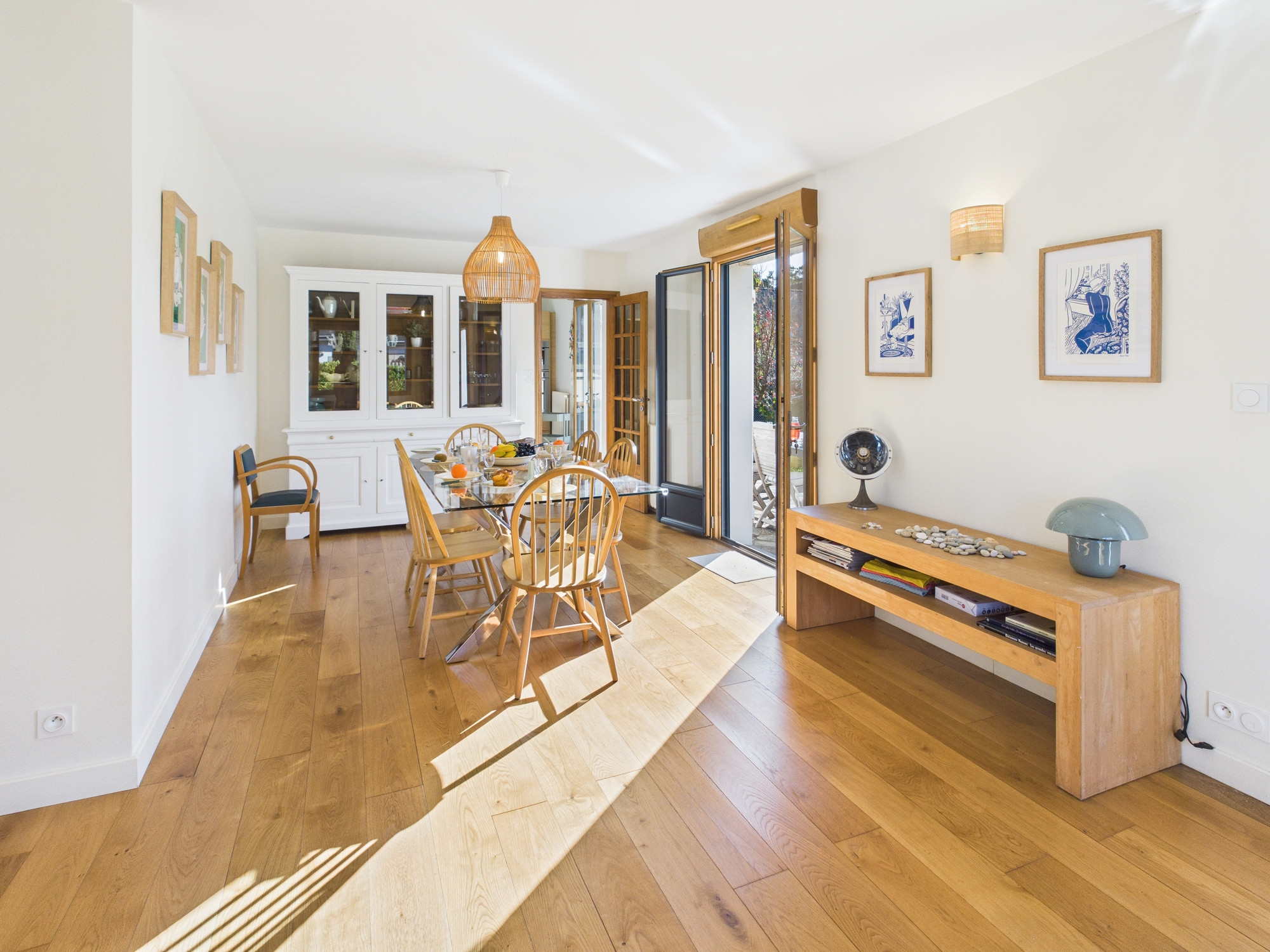 Sur la gauche, vous découvrez un vaste salon-salle à manger à l’atmosphère authentique, avec une grande table à manger, avec des beaux meubles traditionnels. Chaleureux et baigné de lumière naturelle grâce aux grandes baies vitrées, cet espace invite à la détente et aux repas partagés en toute convivialité. Les baies s’ouvrent sur une grande terrasse ensoleillée. Vous trouverez des tables et chaises de jardin, transats et chaises confortables, parfaits pour prolonger les moments en intérieur à l’extérieur, entre ciel bleu et air marin.