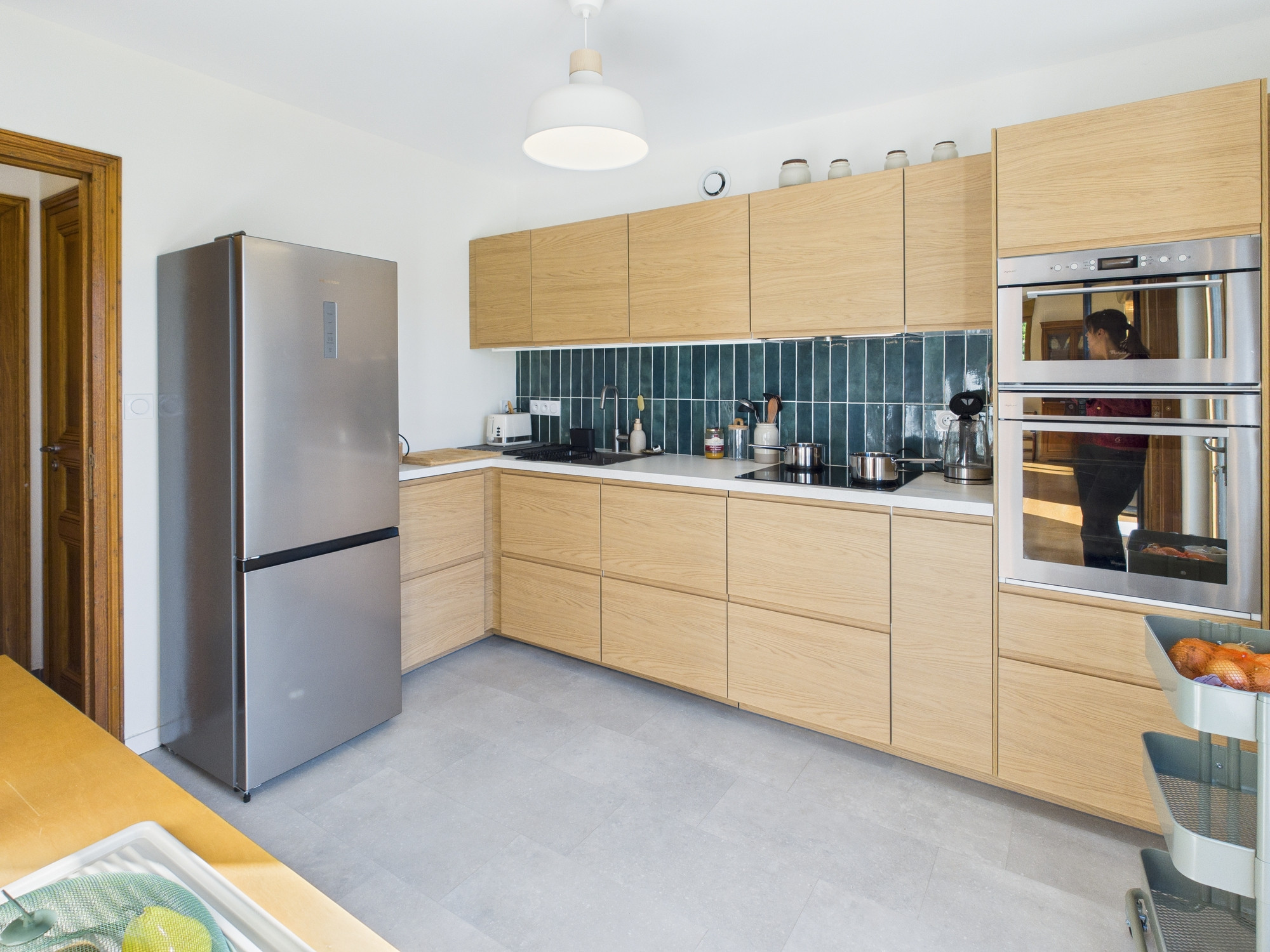 Cette entrée s’ouvre sur une cuisine impressionnante par ses volumes et son style. Equipée et entièrement rénovée avec goût, elle offre tout l’espace nécessaire pour cuisiner, avec la vue sur la mer par sa fenêtre.