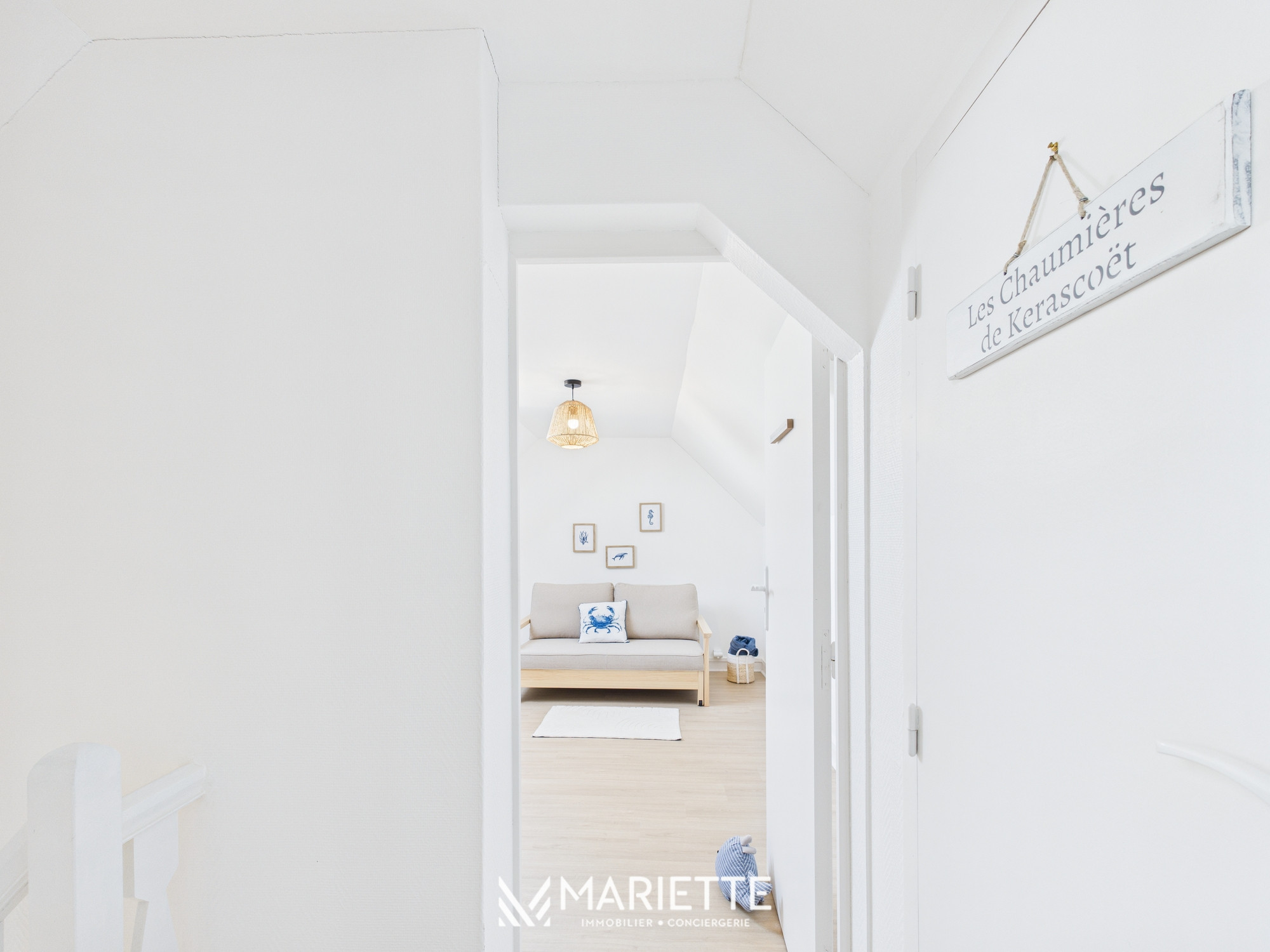 Bienvenue à Hansel, une maison bretonne typique au toit de chaume, nichée à seulement 3 minutes à pied du charmant village de chaumières de Kerascoët. Idéale pour les amoureux de la nature et de la randonnée, cette maison offre un accès direct au célèbre sentier côtier GR34 grâce à un petit portillon depuis le jardin. À 500 mètres, vous découvrirez la côte sauvage, et l’Anse de Rospico se situe à 1,5 km, parfaite pour profiter des paysages marins.