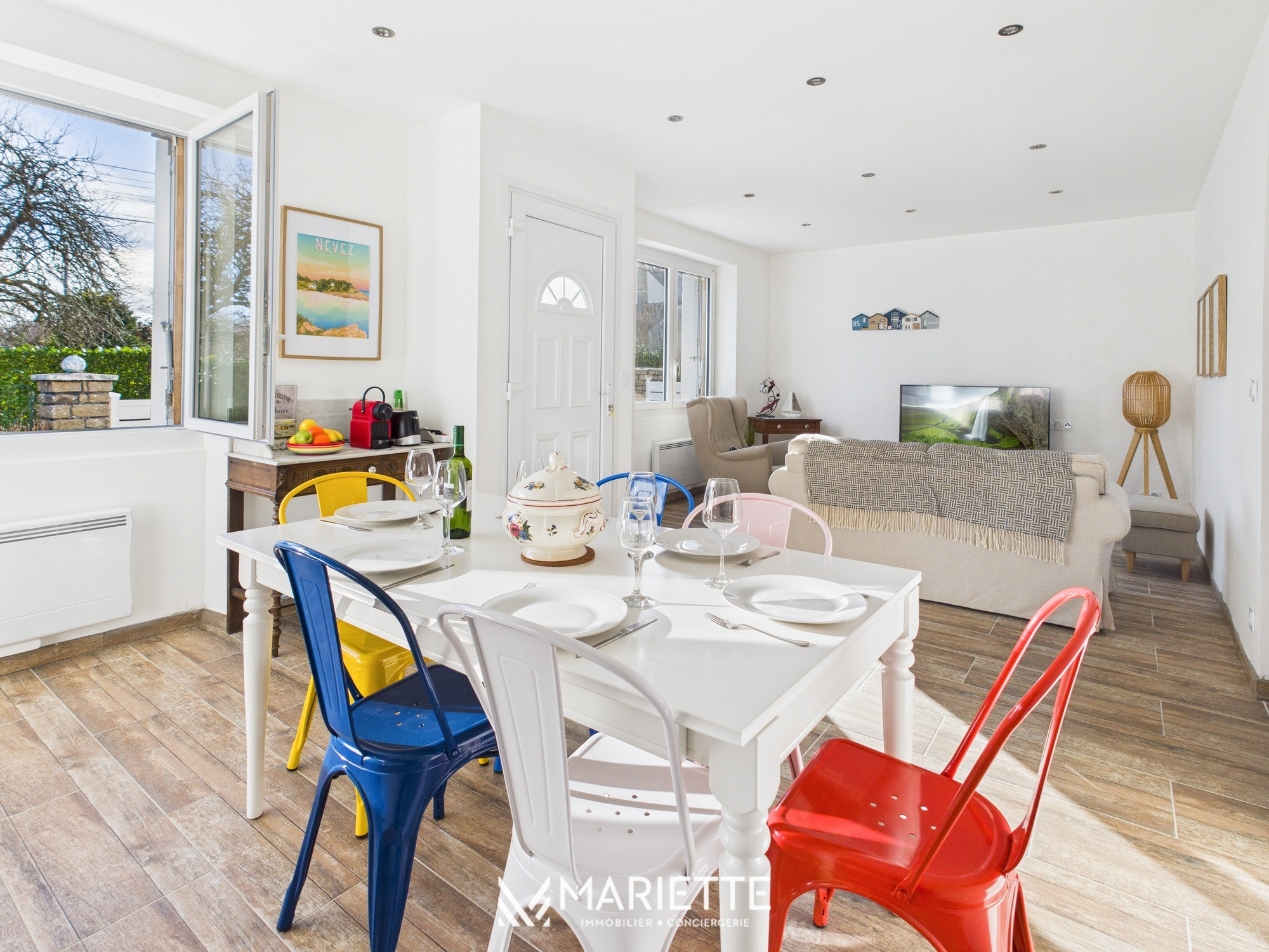 Dans le prolongement, vous découvrirez une spacieuse salle à manger baignée de lumière, grâce à une grande baie vitrée s’ouvrant sur le jardin. Ce bel espace comprend aussi un coin détente cosy, idéal pour lire ou partager un moment de tranquillité face à la verdure.