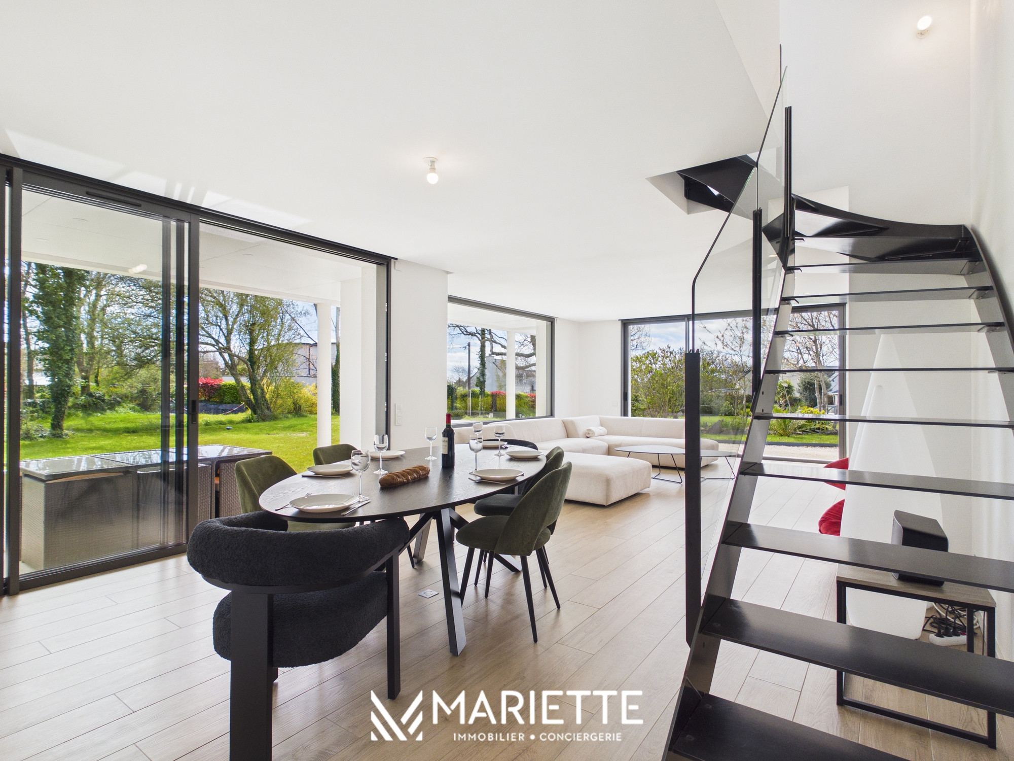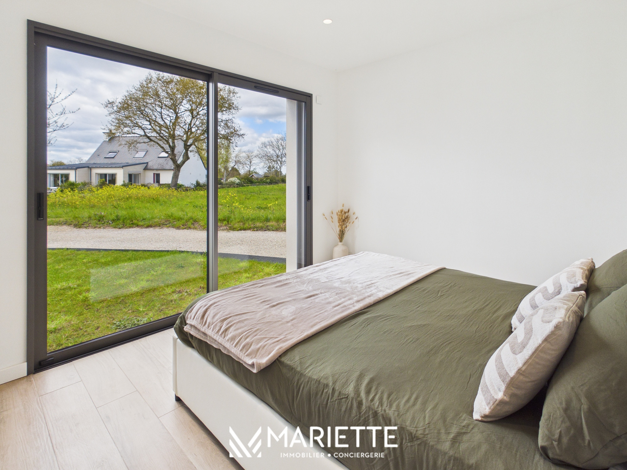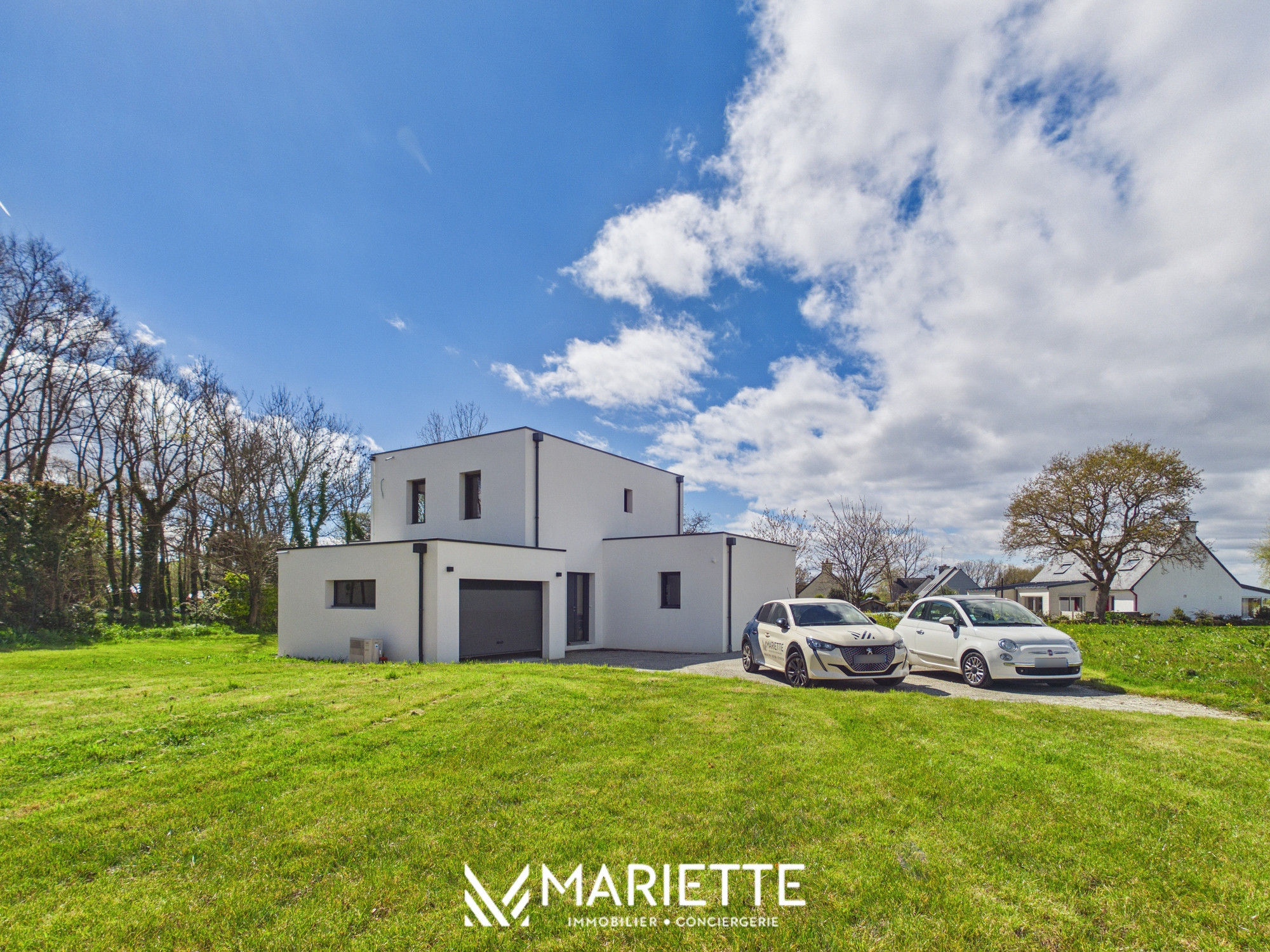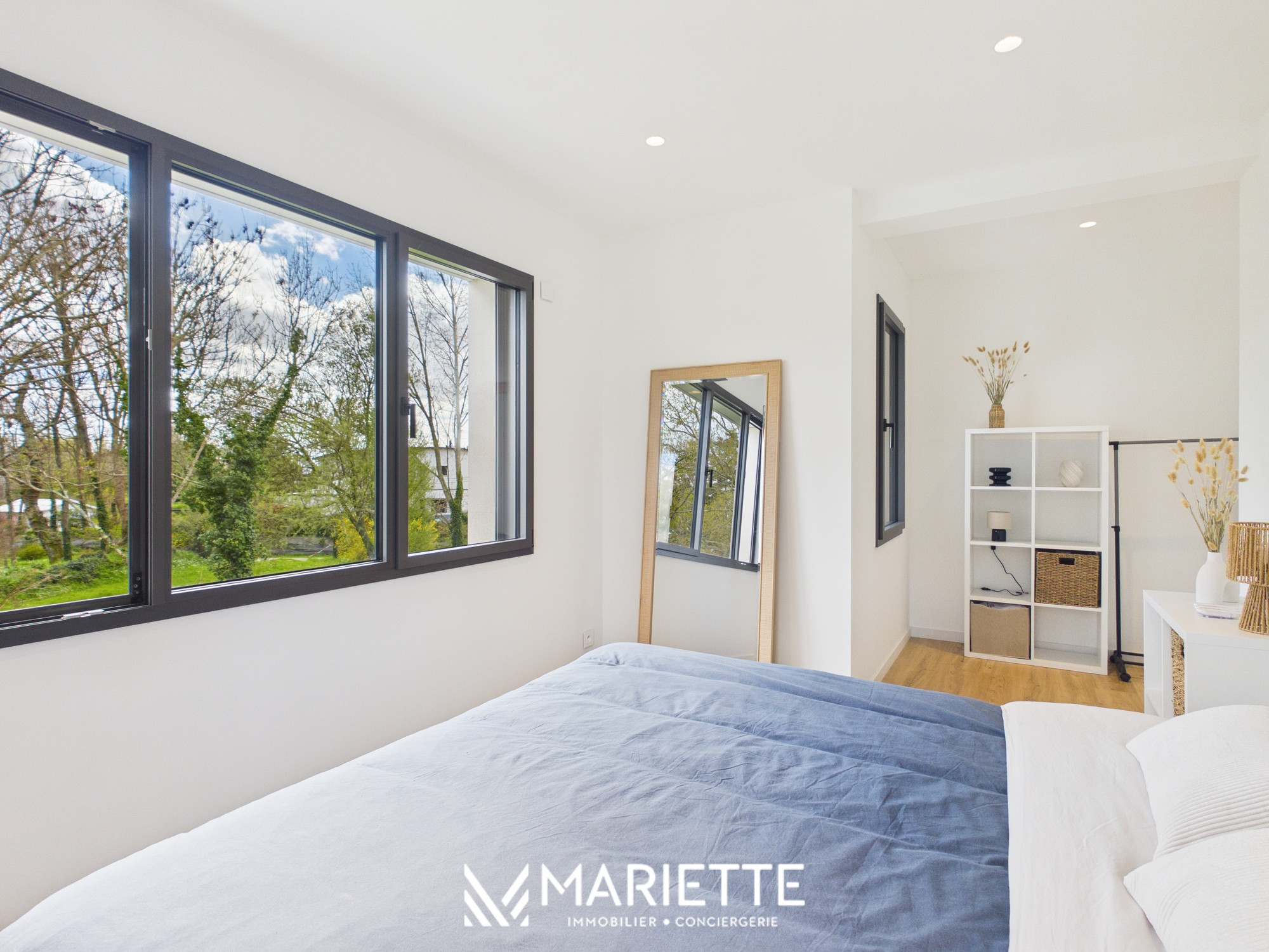 Au rez-de-chaussée, vous découvrirez une entrée avec WC séparés qui s’ouvre sur un vaste espace de vie aux volumes impressionnants, composé d’un salon et d’une salle à manger baignés de lumière grâce à de larges baies vitrées donnant sur le jardin. La cuisine semi-ouverte, entièrement équipée avec des matériaux de qualité, prolonge cet espace convivial et dispose également d’un accès direct vers la terrasse positionnée au Sud. Ce niveau accueille également une magnifique suite parentale avec un grand dressing, une chambre très lumineuse avec baie vitrée ainsi qu’une salle de douche moderne avec douche à l’italienne. À l’étage, la maison propose deux belles chambres confortables ainsi qu’une seconde salle de bain et un deuxième wc séparé permettant à chacun de profiter de son espace en toute tranquillité, que ce soit en famille ou entre amis. À l’extérieur, vous profiterez d’un grand jardin privatif, idéal pour se détendre, partager des repas autour du barbecue ou laisser les enfants jouer en toute sécurité. La maison est parfaitement adaptée aux familles à la recherche de calme et d’espace, mais aussi aux amateurs de nature et de randonnée grâce à sa proximité immédiate avec le célèbre GR34.
