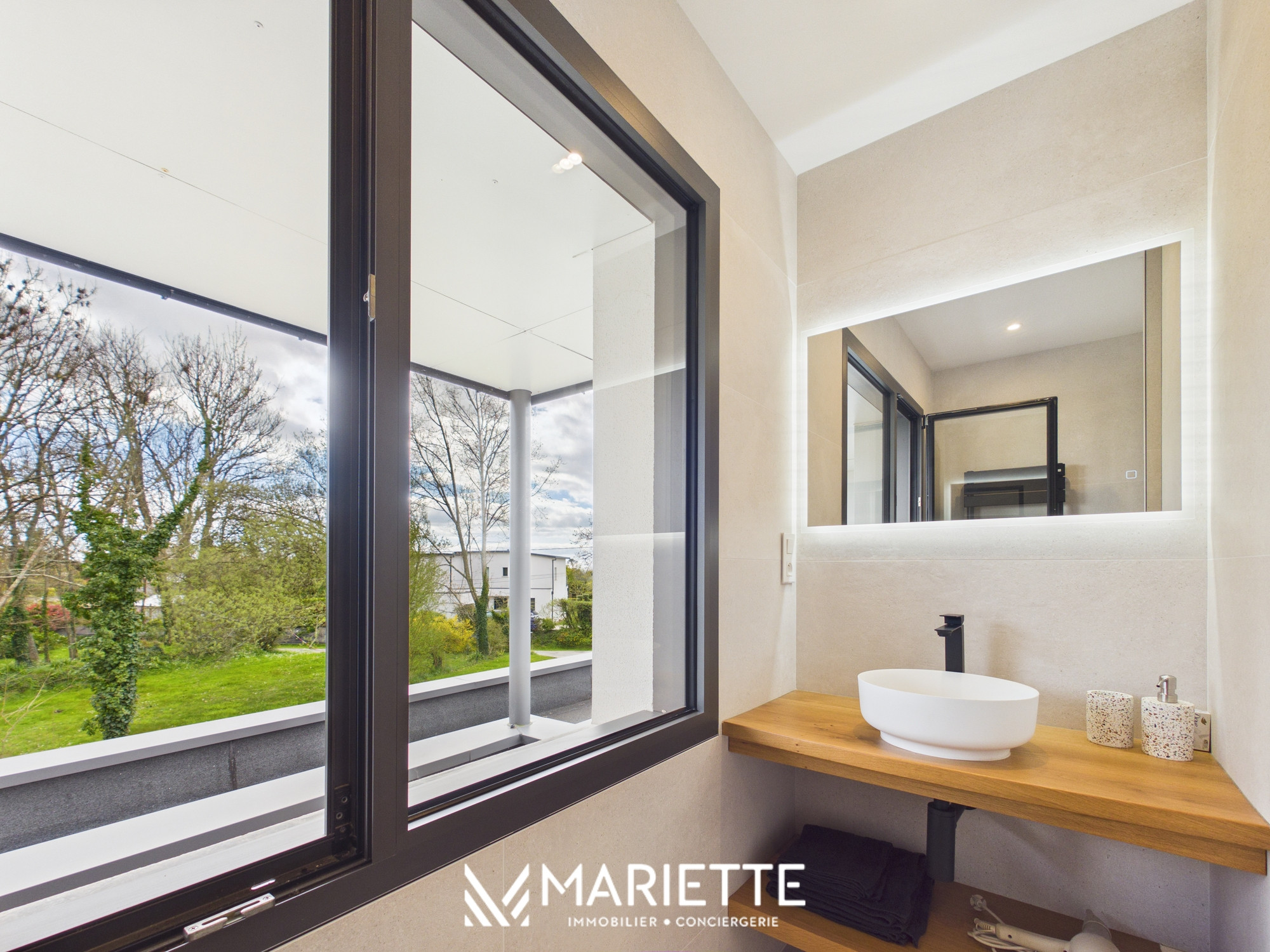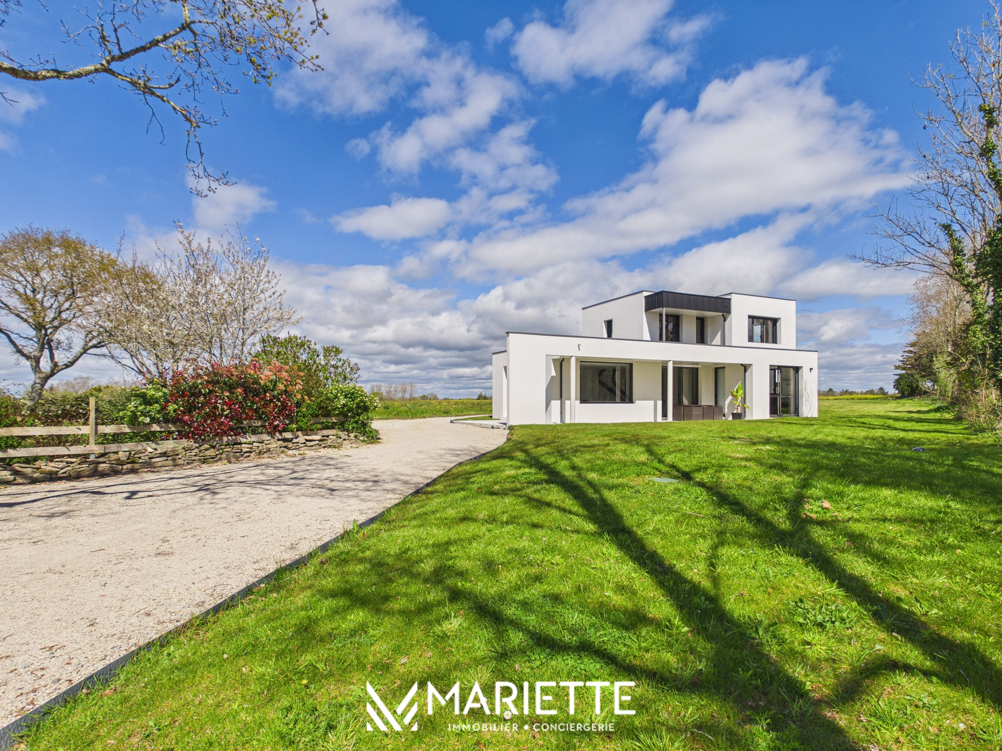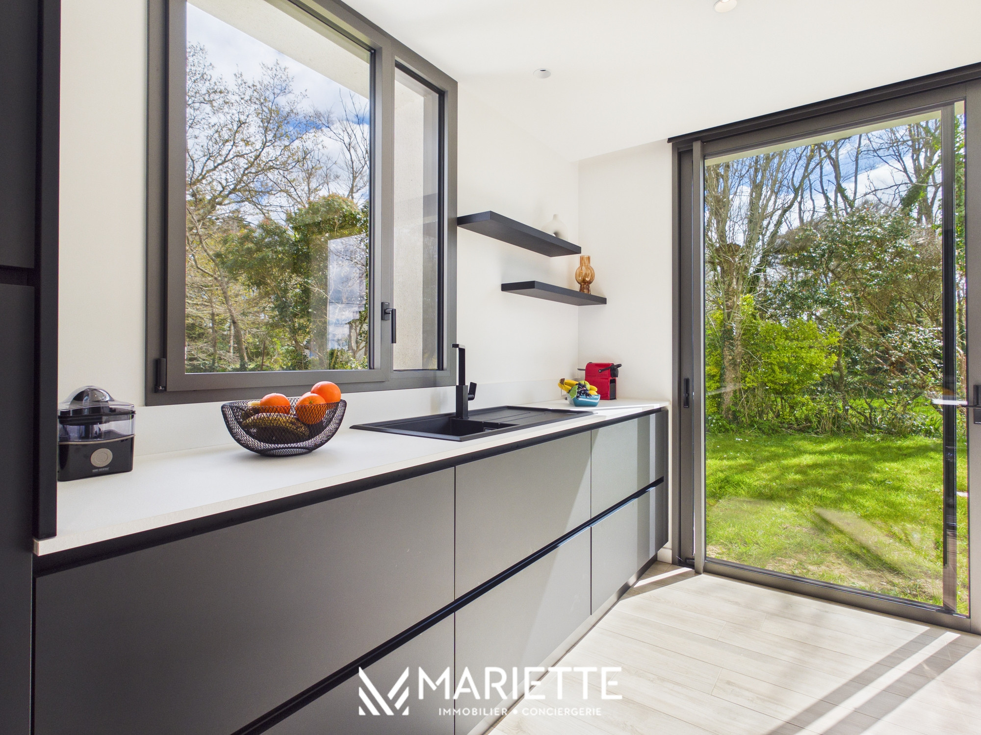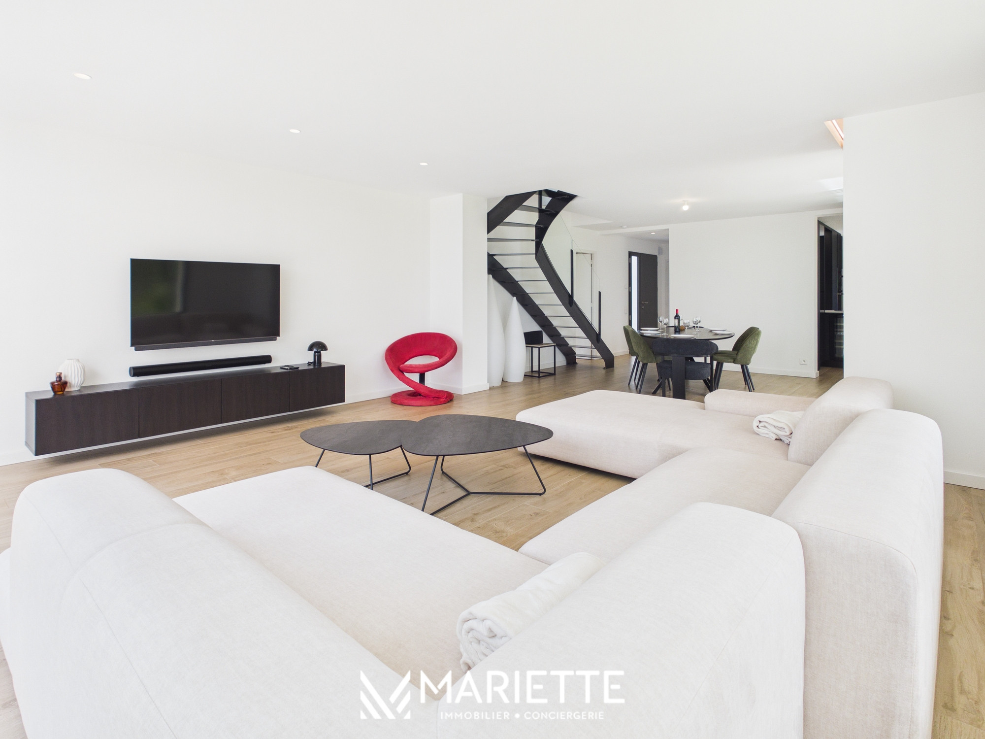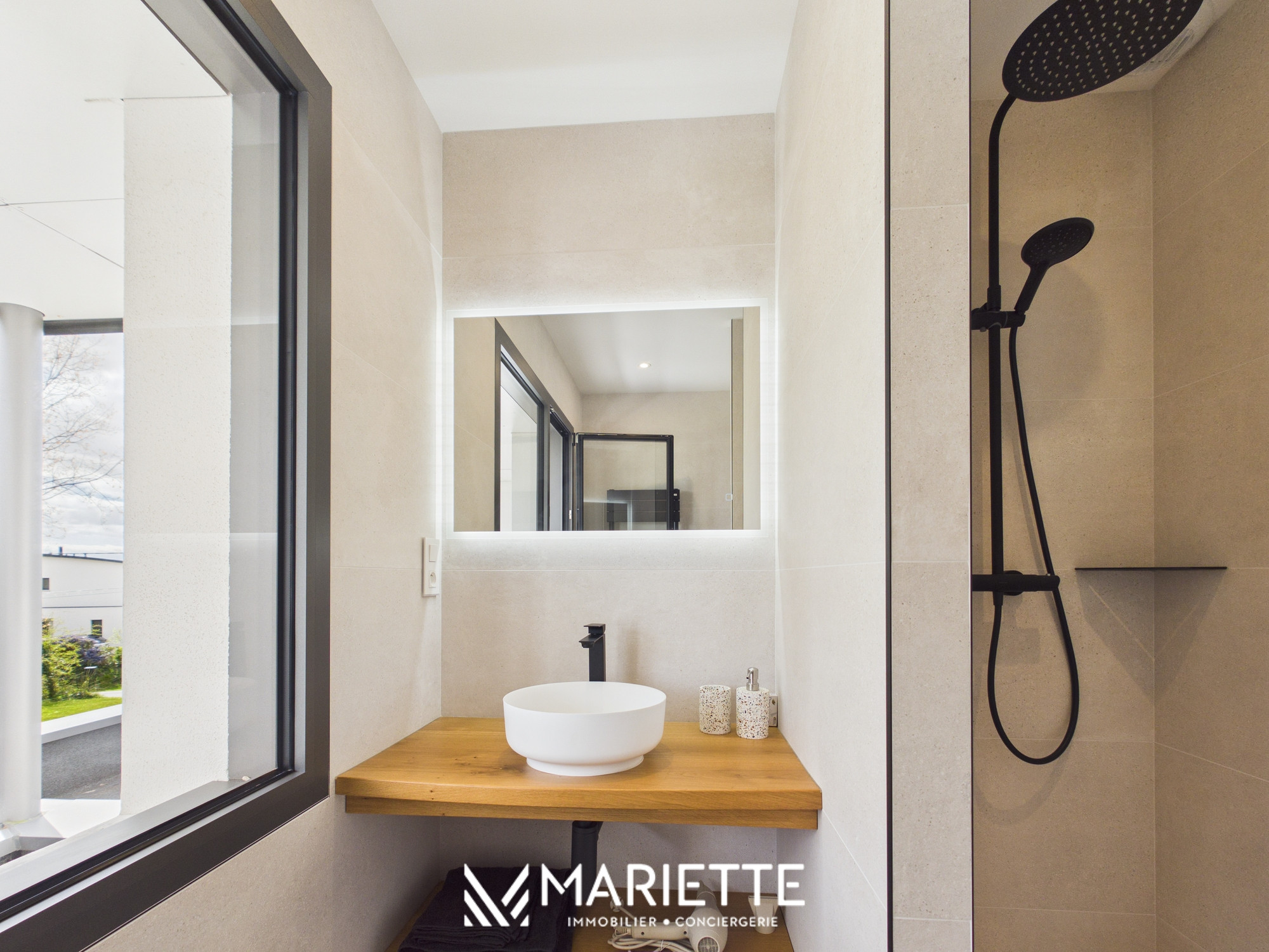 Au rez-de-chaussée, vous découvrirez une entrée avec WC séparés qui s’ouvre sur un vaste espace de vie aux volumes impressionnants, composé d’un salon et d’une salle à manger baignés de lumière grâce à de larges baies vitrées donnant sur le jardin. La cuisine semi-ouverte, entièrement équipée avec des matériaux de qualité, prolonge cet espace convivial et dispose également d’un accès direct vers la terrasse positionnée au Sud. Ce niveau accueille également une magnifique suite parentale avec un grand dressing, une chambre très lumineuse avec baie vitrée ainsi qu’une salle de douche moderne avec douche à l’italienne. À l’étage, la maison propose deux belles chambres confortables ainsi qu’une seconde salle de bain et un deuxième wc séparé permettant à chacun de profiter de son espace en toute tranquillité, que ce soit en famille ou entre amis. À l’extérieur, vous profiterez d’un grand jardin privatif, idéal pour se détendre, partager des repas autour du barbecue ou laisser les enfants jouer en toute sécurité. La maison est parfaitement adaptée aux familles à la recherche de calme et d’espace, mais aussi aux amateurs de nature et de randonnée grâce à sa proximité immédiate avec le célèbre GR34.