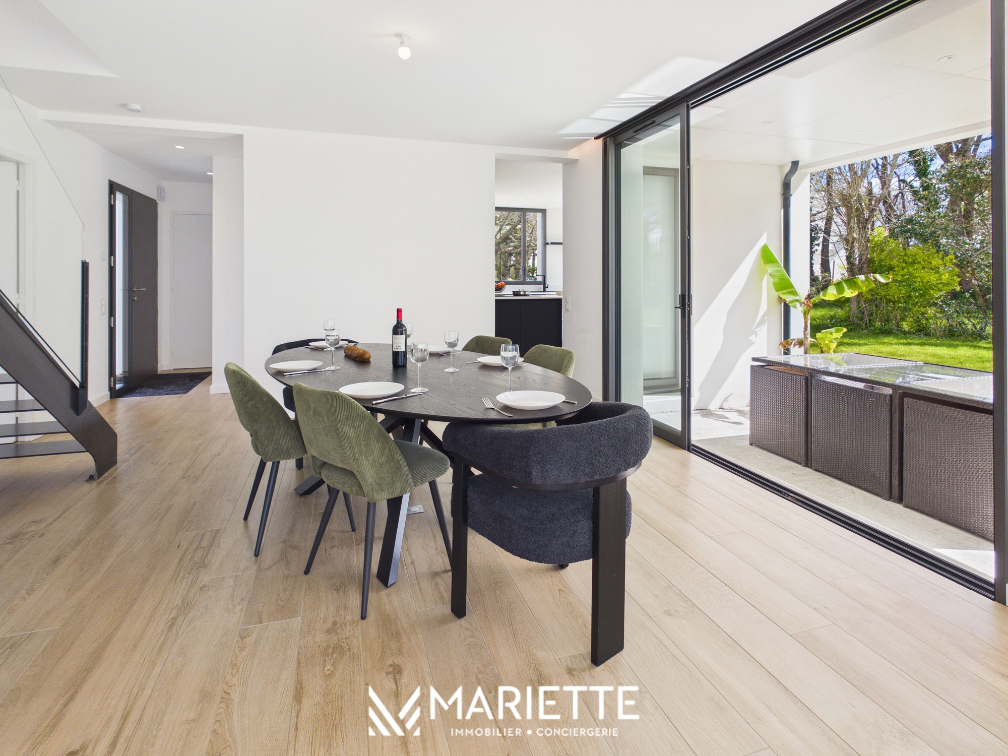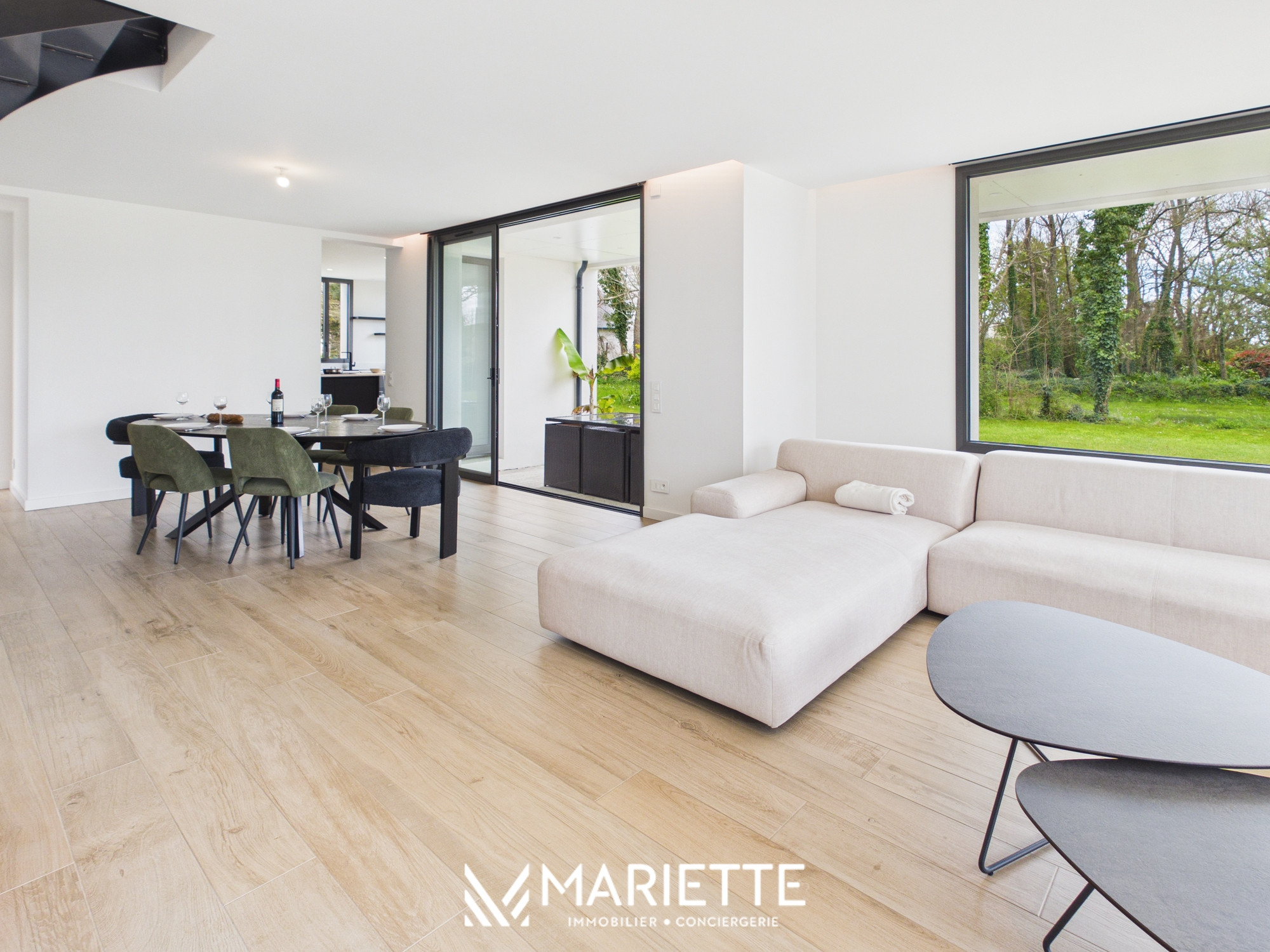Dans le prolongement, vous découvrirez une spacieuse salle à manger baignée de lumière, grâce à une grande baie vitrée s’ouvrant sur le jardin. Ce bel espace comprend aussi un coin détente cosy, idéal pour lire ou partager un moment de tranquillité face à la verdure.