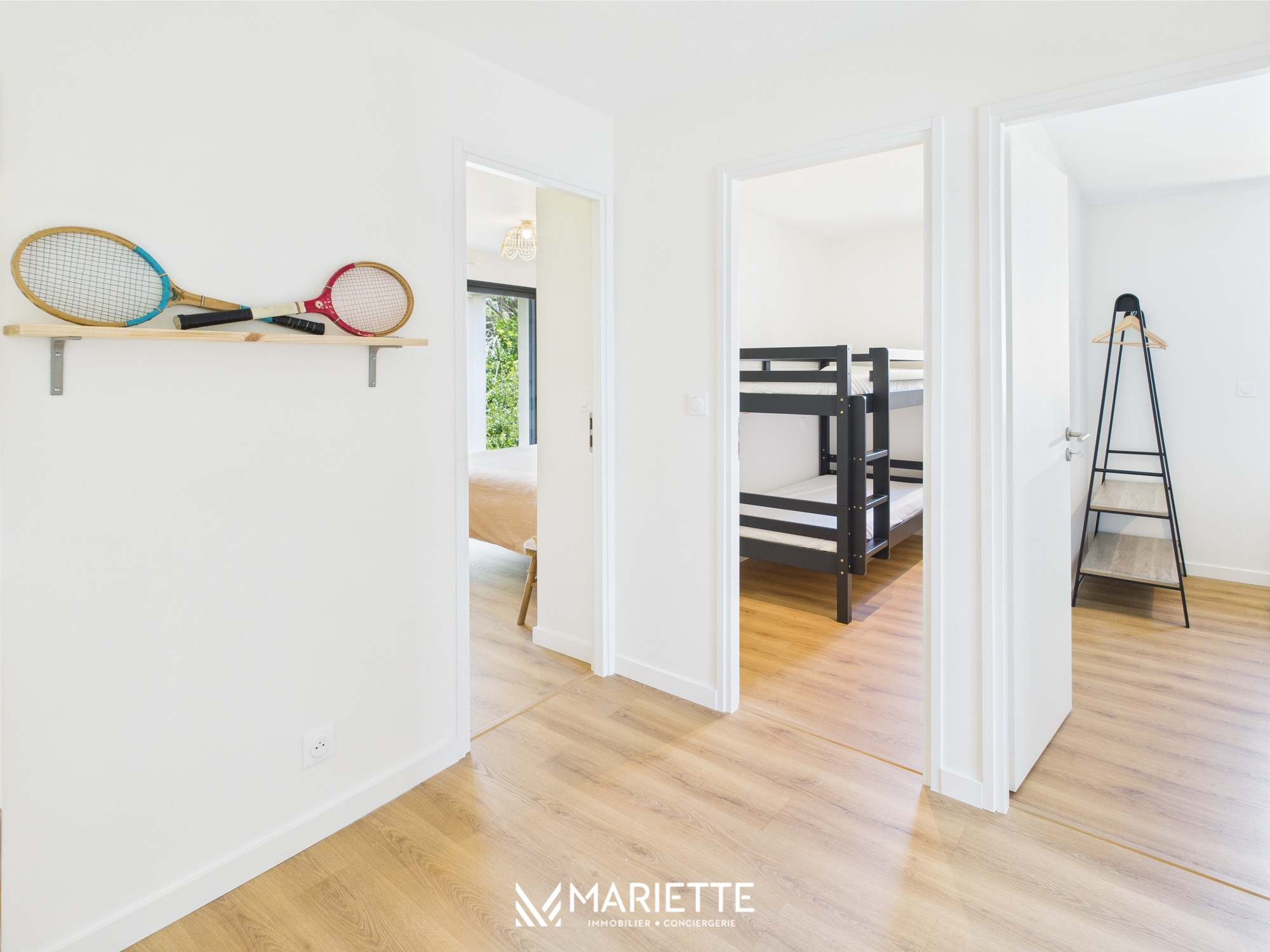 Un escalier baigné de lumière conduit à l’étage, où un espace détente dans un esprit africain accueille un lit-banquette et une télévision. En enfilade, on découvre trois belles chambres, chacune avec une décoration soignée et une ambiance propre : une chambre inspirée de la nature, une autre autour de la mer et du surf, et une troisième toute douce, dédiée aux plus petits, avec un lit bébé à barreaux sur le thème végétal. L’étage comprend également une seconde salle de bain avec baignoire, ainsi que des toilettes indépendantes.