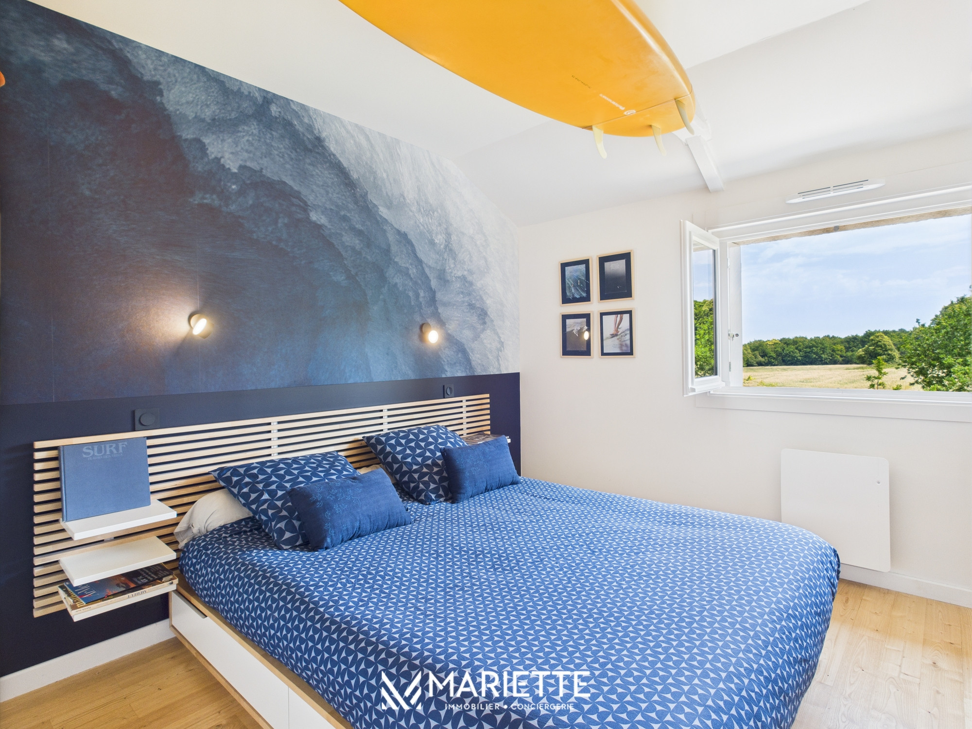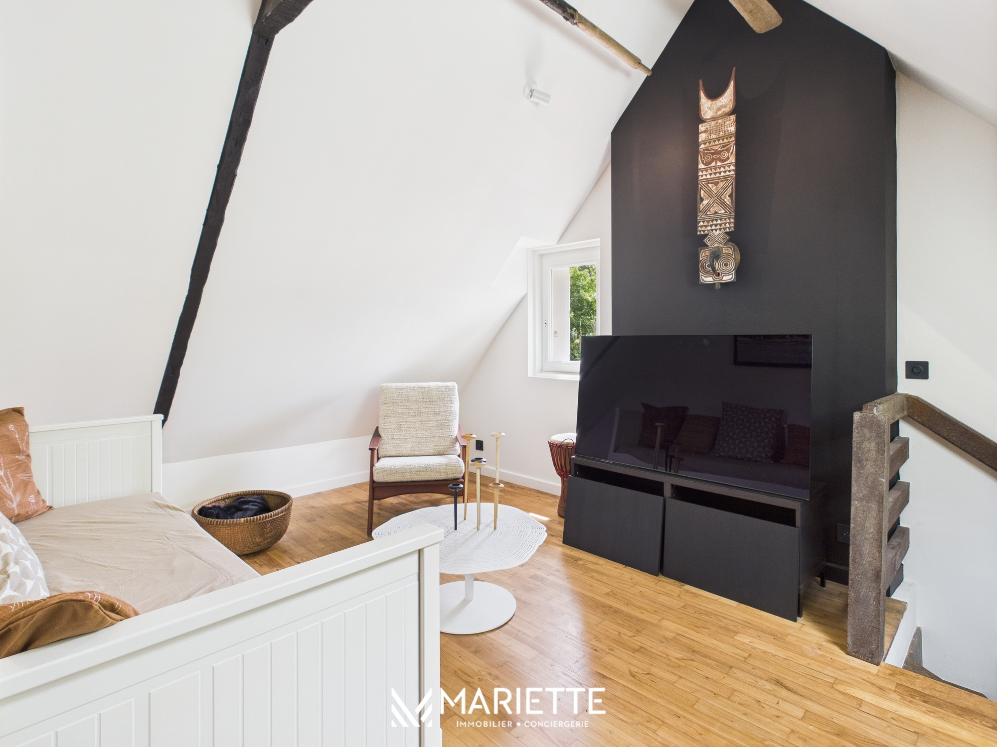 Un escalier baigné de lumière conduit à l’étage, où un espace détente dans un esprit africain accueille un lit-banquette et une télévision. En enfilade, on découvre trois belles chambres, chacune avec une décoration soignée et une ambiance propre : une chambre inspirée de la nature, une autre autour de la mer et du surf, et une troisième toute douce, dédiée aux plus petits, avec un lit bébé à barreaux sur le thème végétal. L’étage comprend également une seconde salle de bain avec baignoire, ainsi que des toilettes indépendantes.