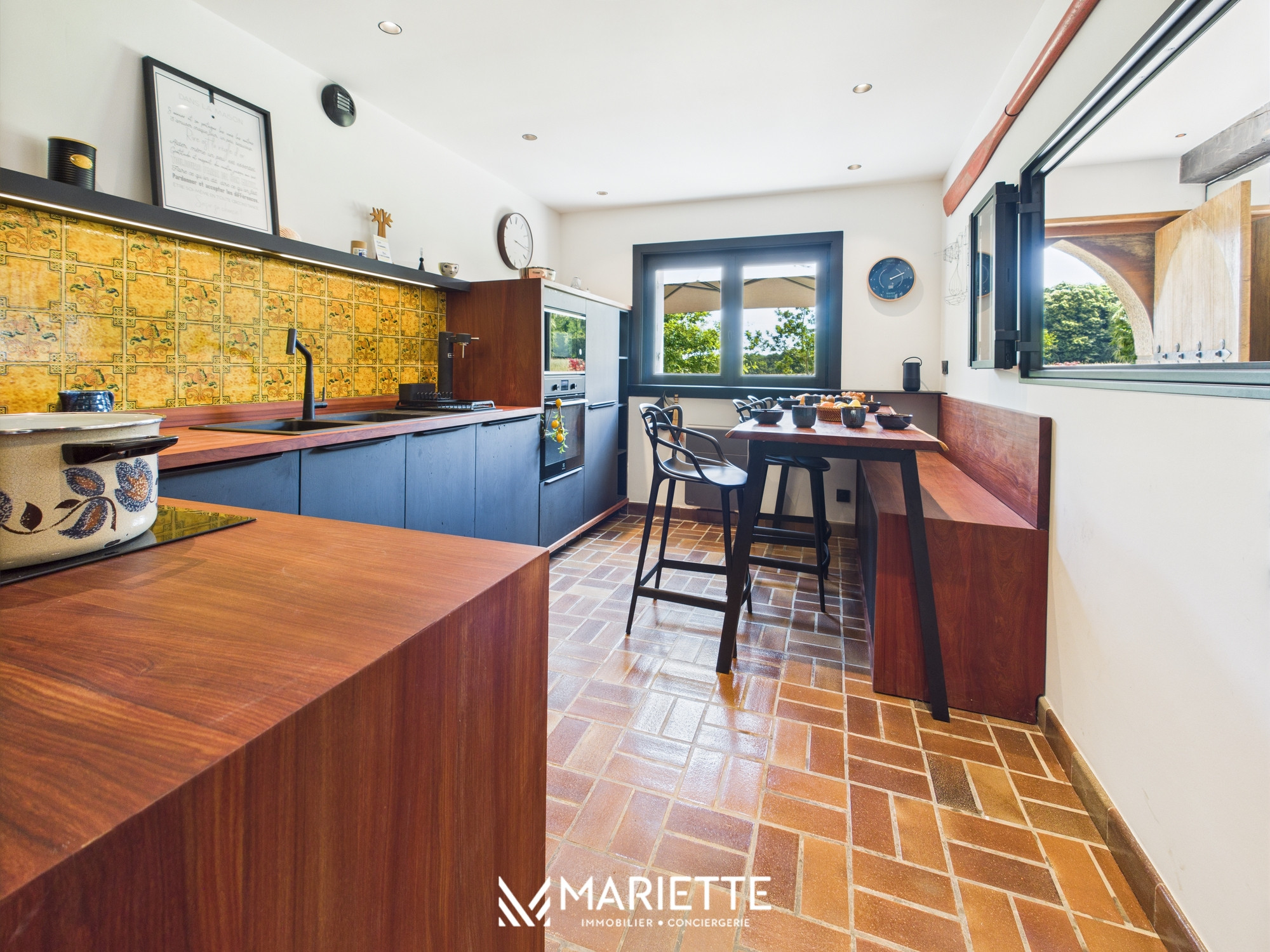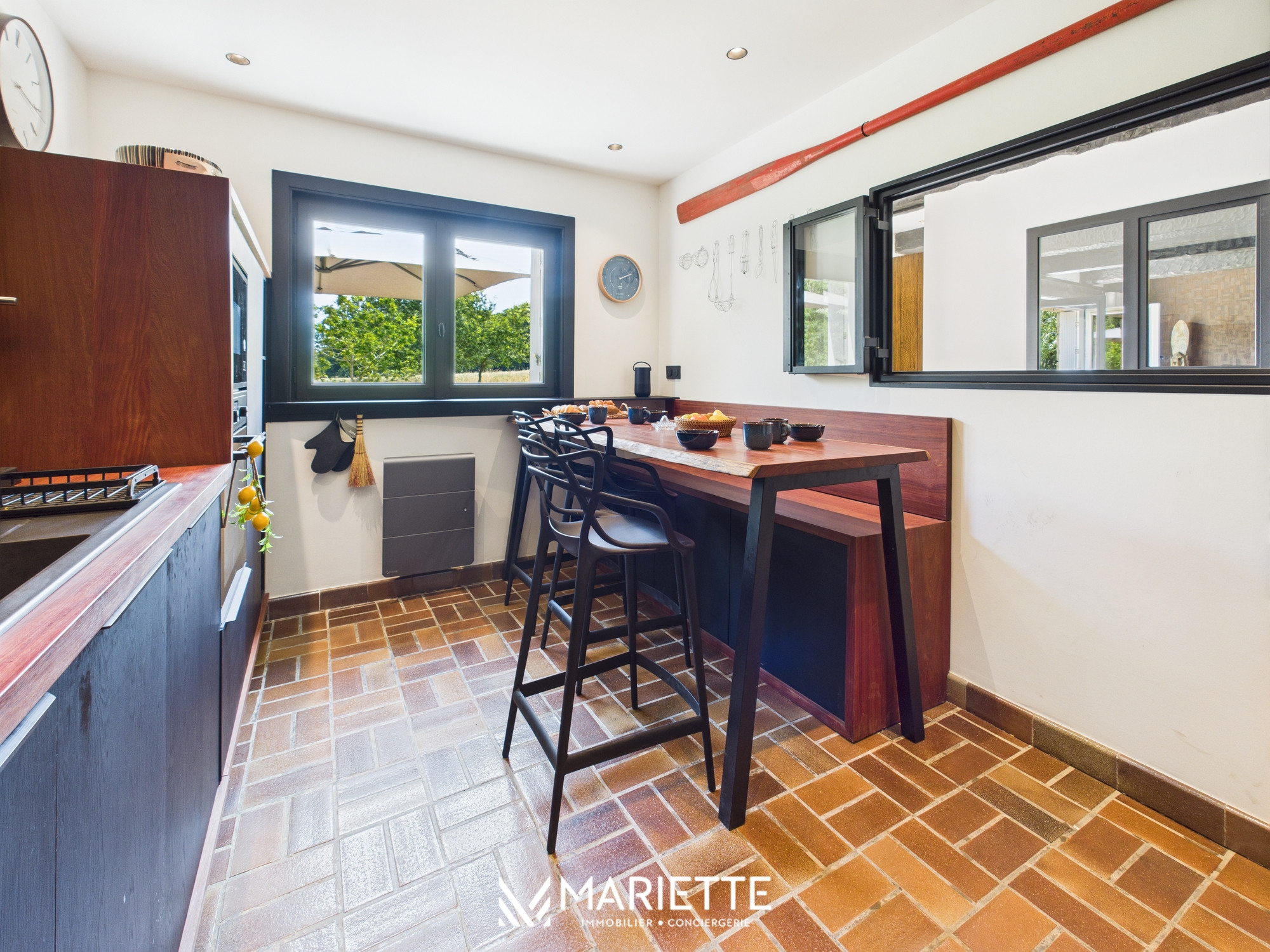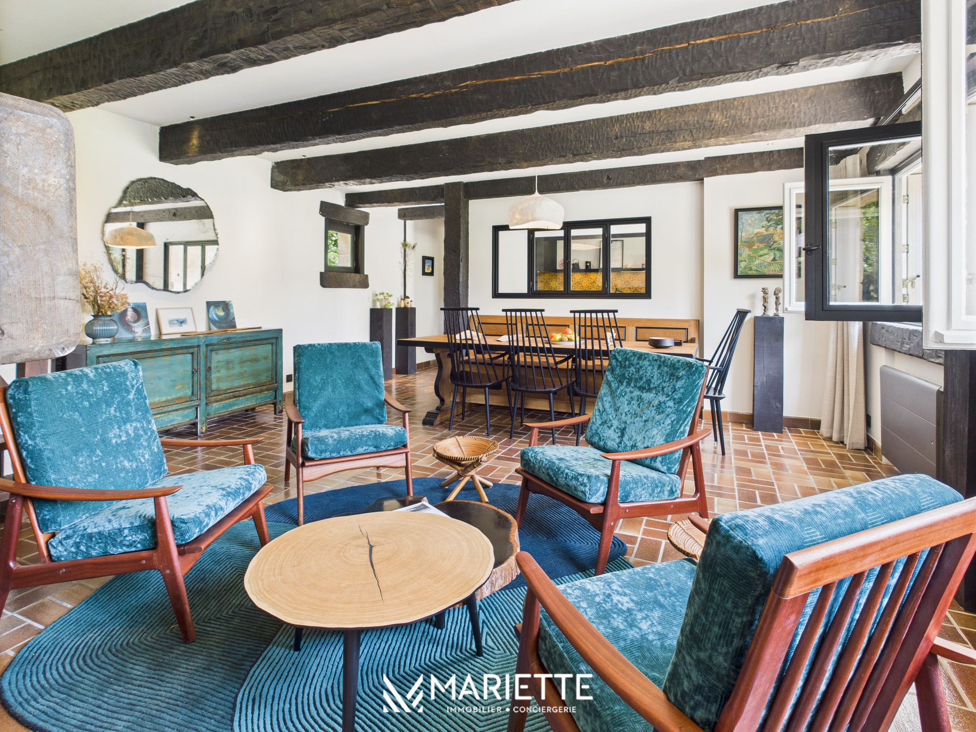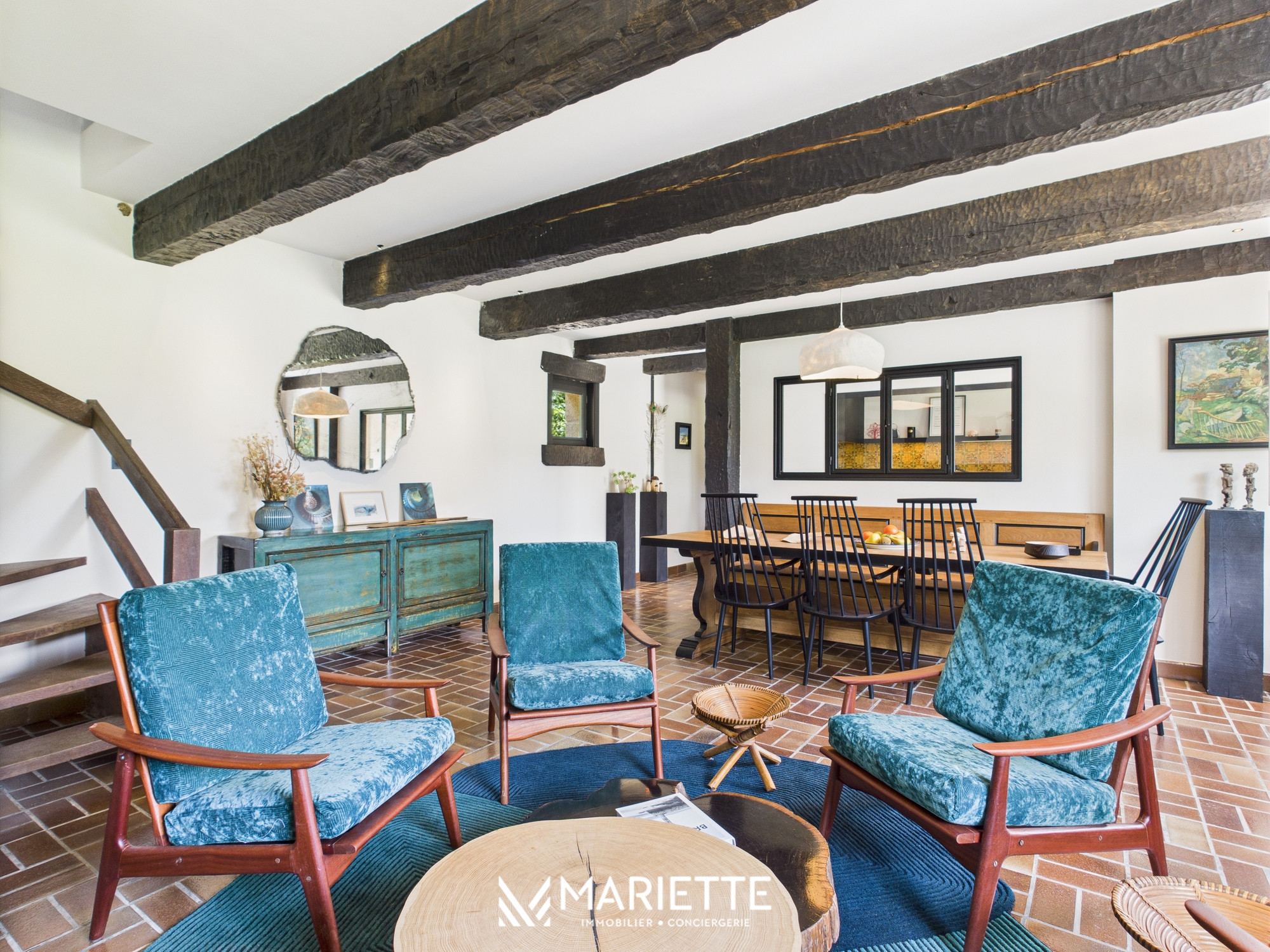 Dès l’entrée, on ressent le soin apporté aux détails. À droite, une cuisine indépendante, entièrement équipée, permet de cuisiner comme à la maison. Le long couloir dessert des toilettes séparées, une salle de bain avec douche à l’italienne qui a su conserver le charme de l’ancien avec son carrelage d’origine, ainsi qu’une première chambre au rez-de-chaussée, lumineuse et tournée vers le jardin. Toujours au rez-de-chaussée, la salle à manger s’organise autour d’une table exceptionnelle, parfaite pour des repas conviviaux, tandis que le salon offre un espace cosy avec quatre fauteuils confortables et une cheminée (non fonctionnelle) qui complète l’ambiance chaleureuse.
