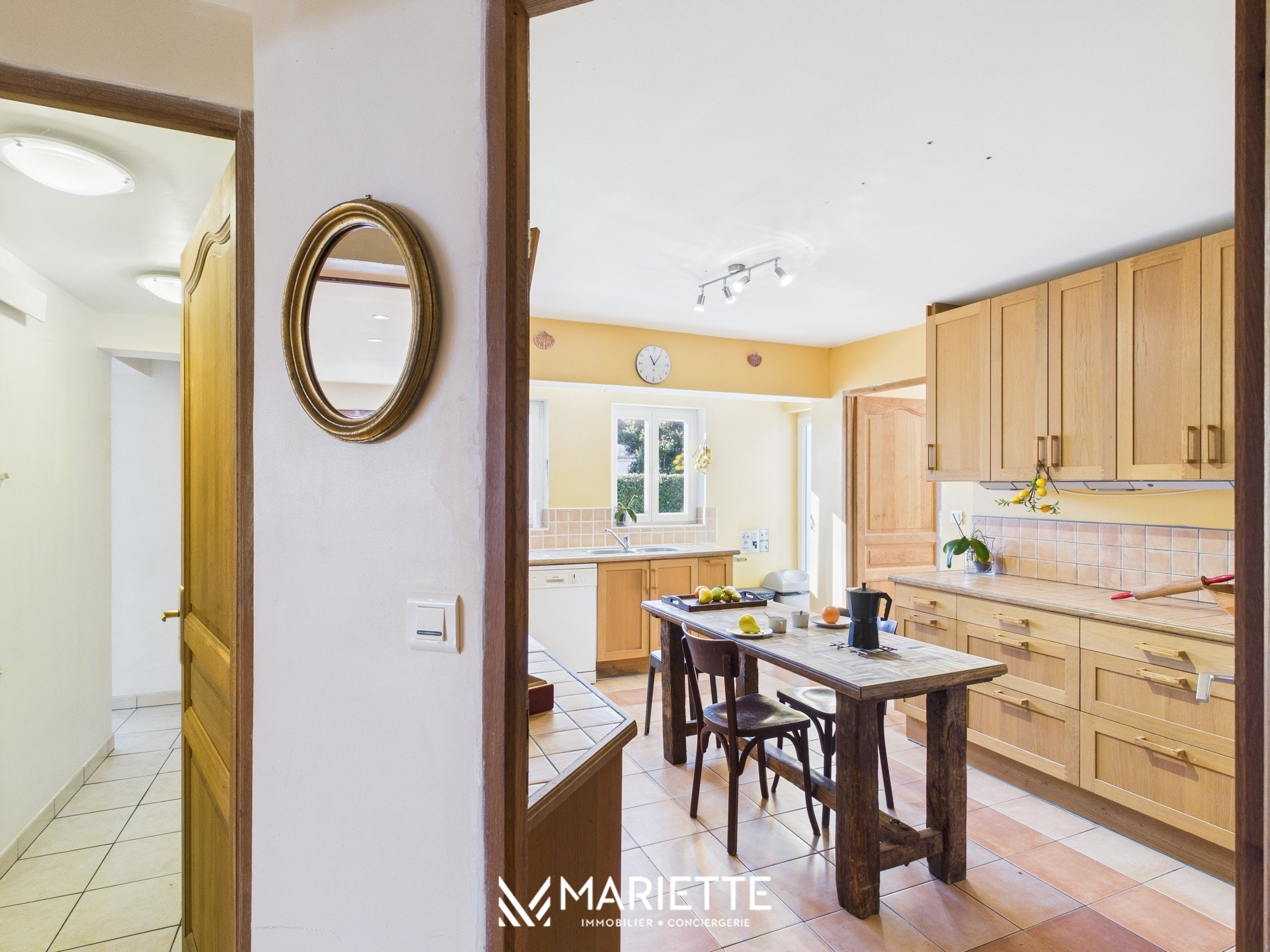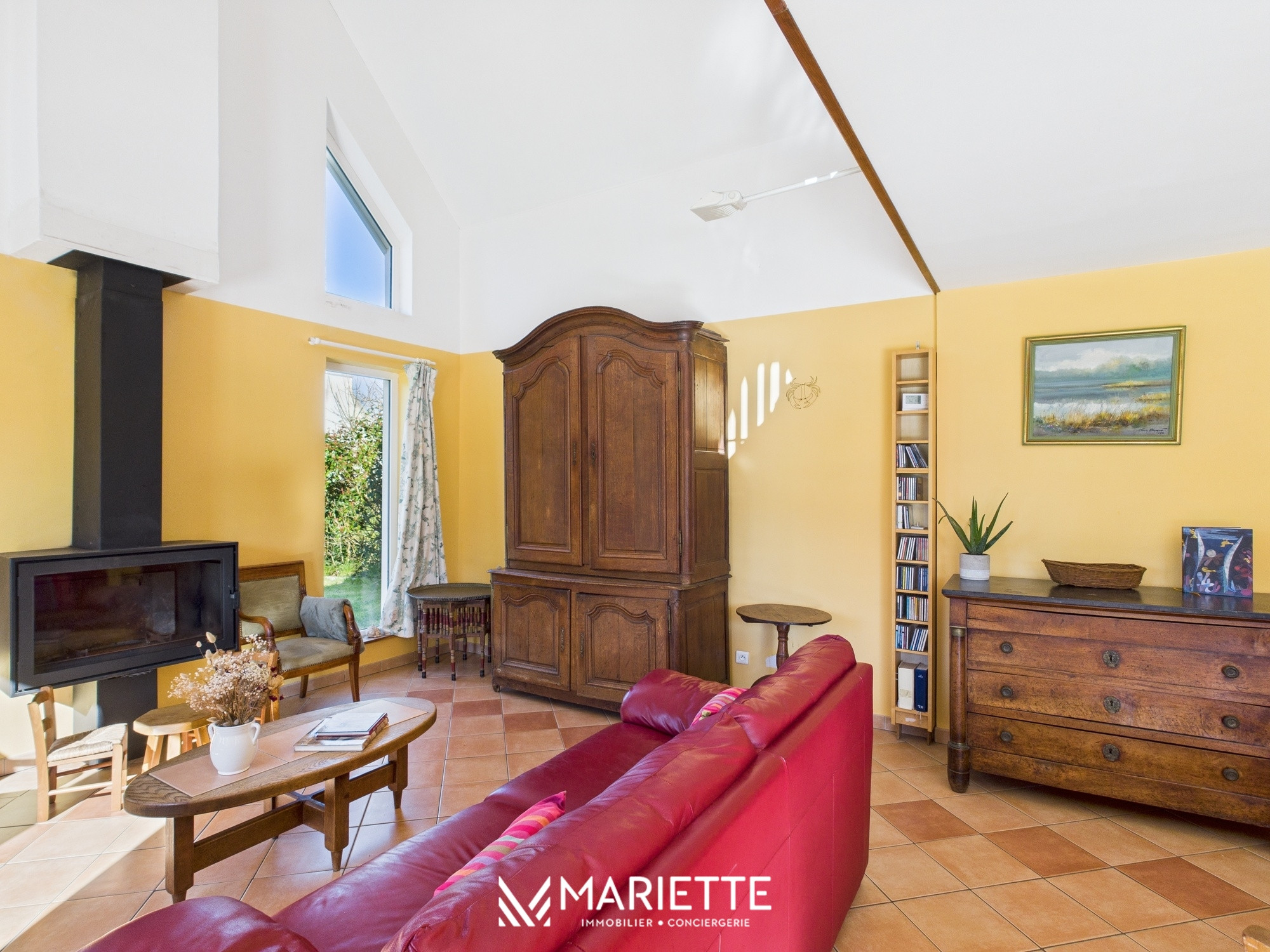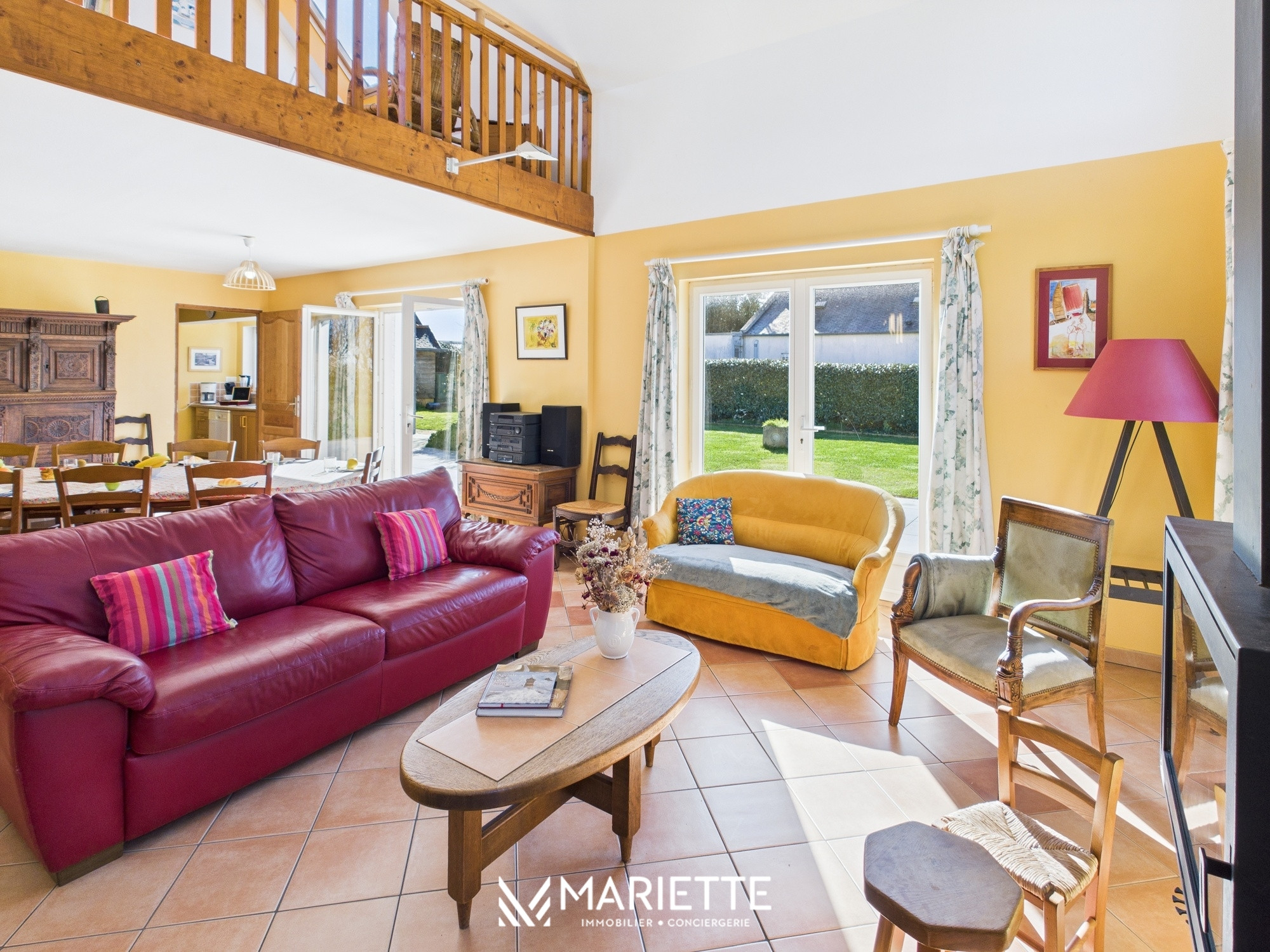 Dès votre arrivée, une entrée chaleureuse vous accueille, avec un grand dressing. Puis, vous accédez à un vaste salon doté d'un plafond cathédrale, offrant une superbe sensation d'espace et de luminosité. Attenante au salon se trouve la salle à manger, équipée d'une grande table pouvant accueillir jusqu'à 10 convives. Ces deux espaces donnent sur un vaste jardin arboré vous invitant à la détente, parfait pour profiter des journées ensoleillées autour d'un apéritif ou d'un barbecue. Puis, la cuisine, entièrement équipée, est indépendante du salon et dispose d’un espace de stockage pour vos denrées alimentaires.