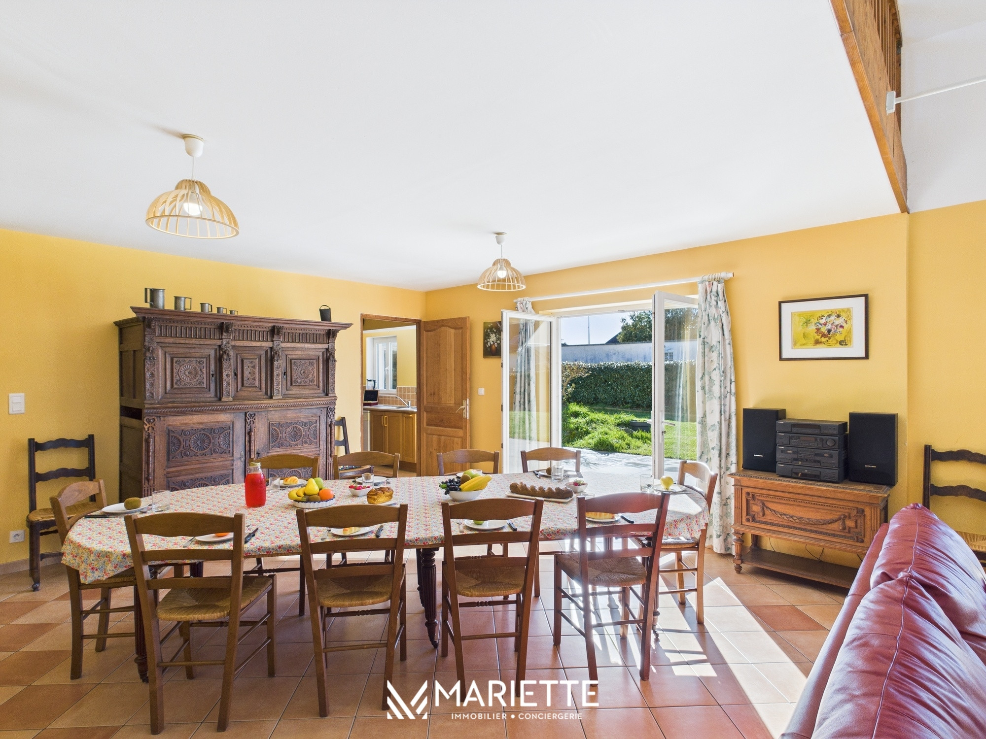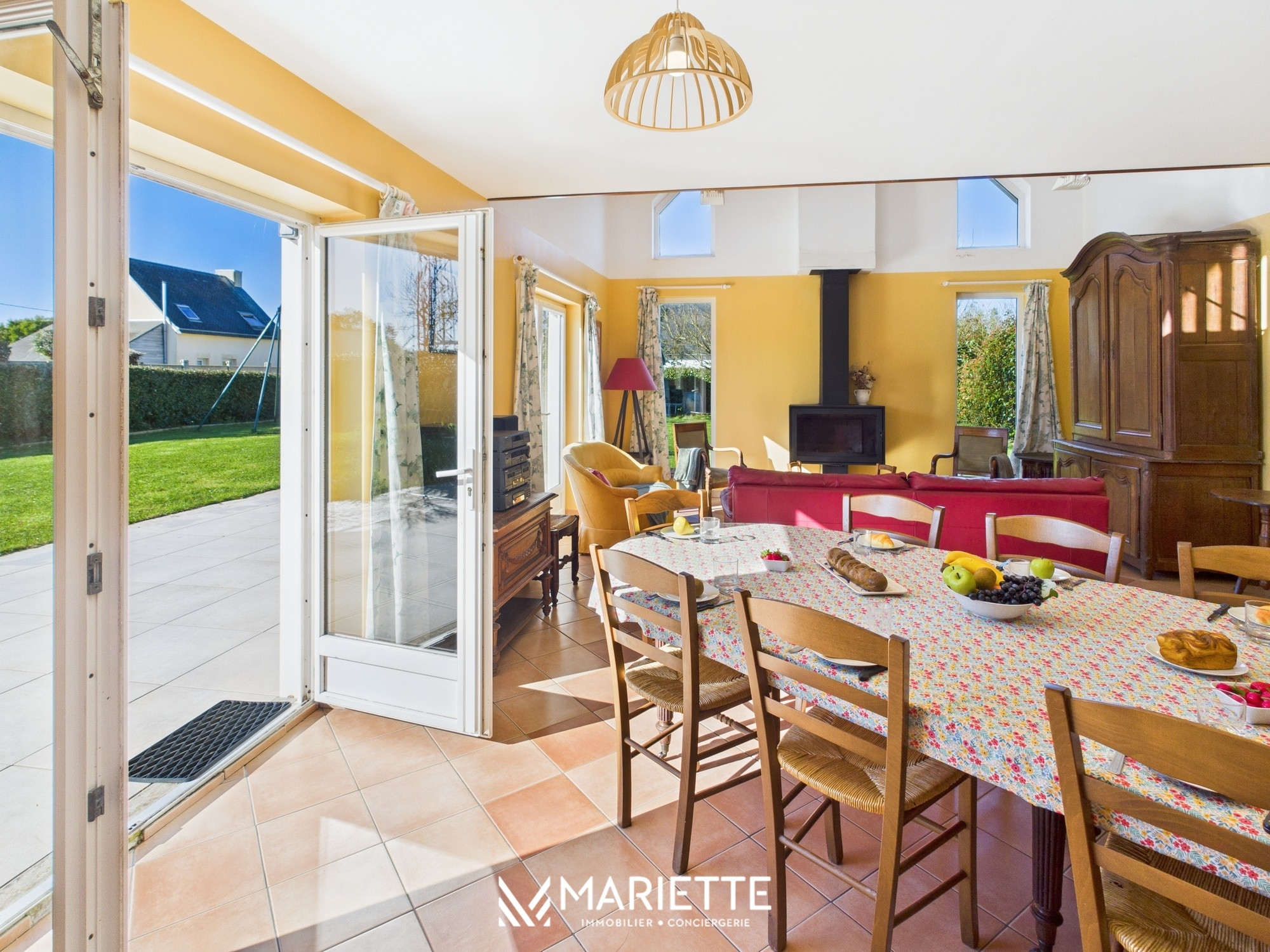La grande cuisine séparée, entièrement équipée, vous permettra de préparer de délicieux repas. Vous trouverez ensuite une spacieuse salle à manger avec le salon, dotés d’un plafond cathédral (attention, il n’y a pas de télévision dans le salon). L’ambiance est chaleureuse et conviviale, avec une grande table idéale pour des repas en famille ou entre amis. Depuis ces espaces, vous accédez directement au vaste jardin et à sa terrasse, où vous pourrez prendre l’apéritif au soleil pendant que les enfants s’amusent sur la balançoire.