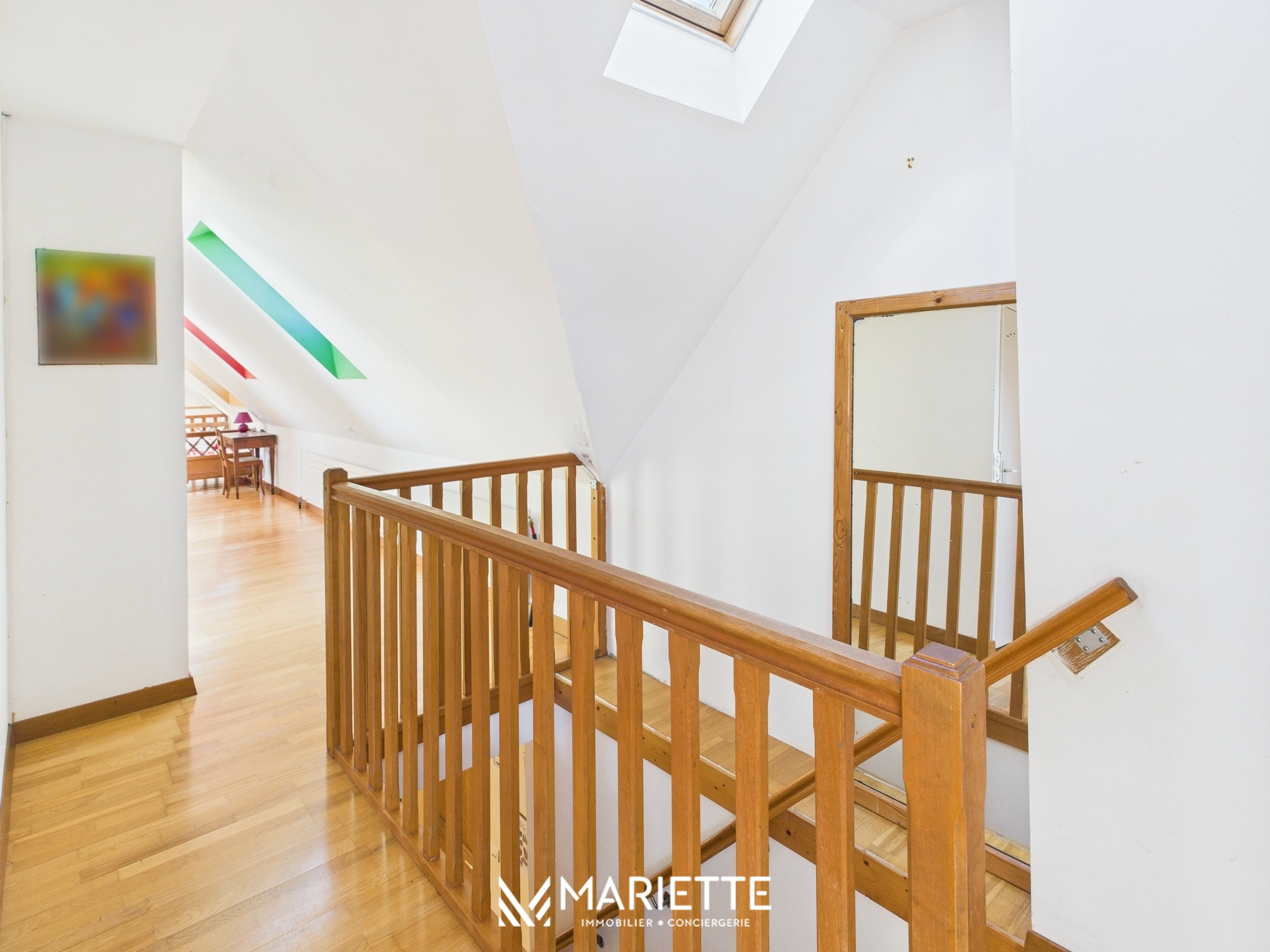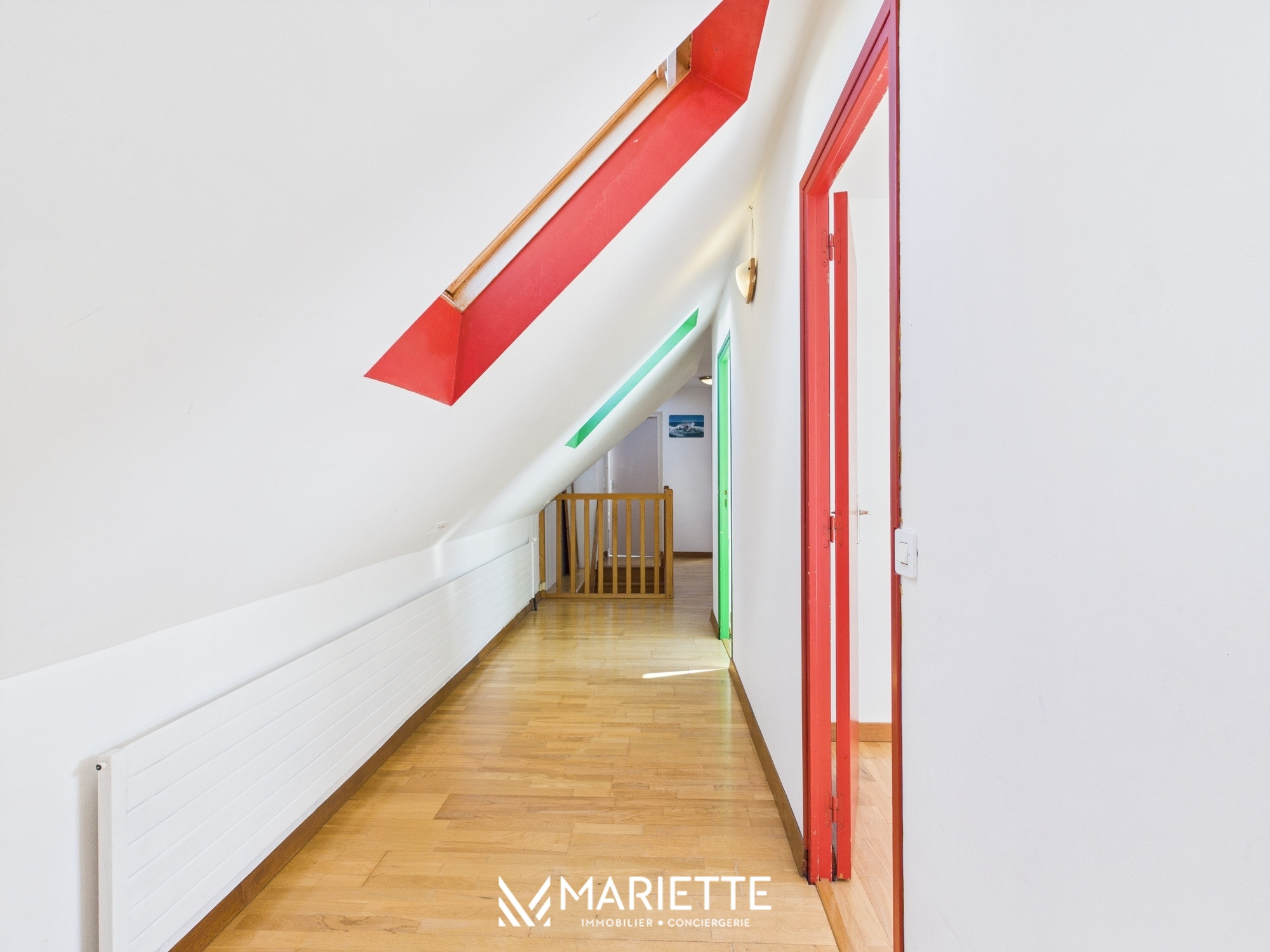 Enfin, empruntez le bel escalier pour rejoindre l'étage, où vous découvrirez une grande chambre avec salle de douche privative. Le couloir mène ensuite à des toilettes séparées, et à un sas avec des jeux de société, et à trois autres chambres confortables. Une salle d'eau supplémentaire avec douche est également disponible à ce niveau.