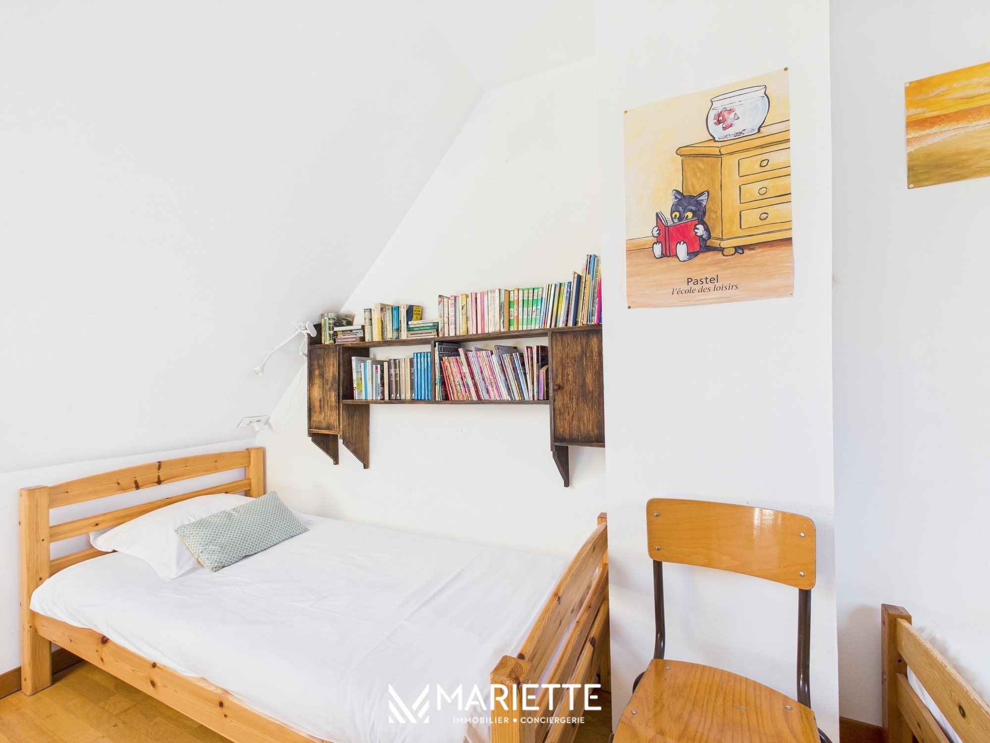 L’étage, accessible par un escalier, abrite l’espace nuit. Vous y découvrirez quatre chambres en enfilade : une avec deux lits simples, un dortoir avec deux lits simples et un lit superposé, ainsi que deux chambres avec des lits doubles. À cet étage, vous trouverez aussi deux petites salles de douche et un WC séparé. Pour vos moments de calme, une jolie mezzanine aménagée, surplombant le salon, offre un espace idéal pour lire ou se détendre après une journée bien remplie à la plage.