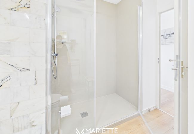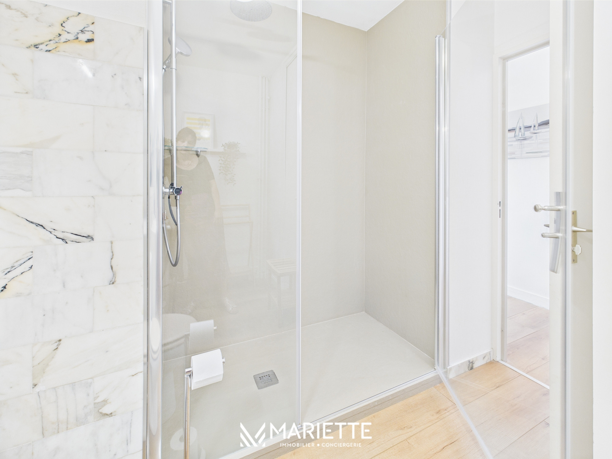 Dès l’entrée, un couloir vous guide vers les différentes pièces de l’appartement. Sur la gauche, une grande salle de bain vous accueille, équipée d’une douche à l’italienne confortable ainsi que d’un lave-linge, parfait pour les séjours prolongés. La décoration est sobre et élégante, pour un confort maximal.